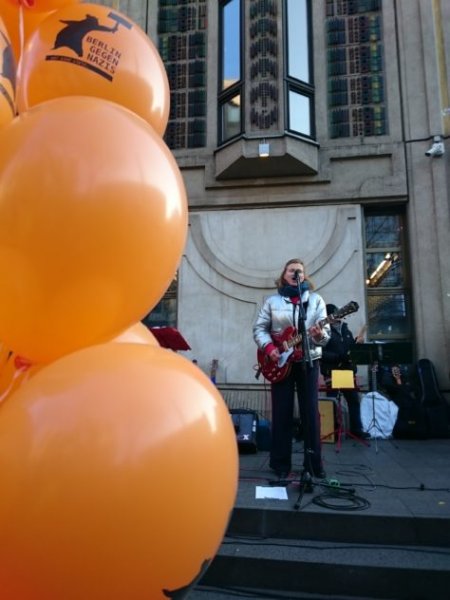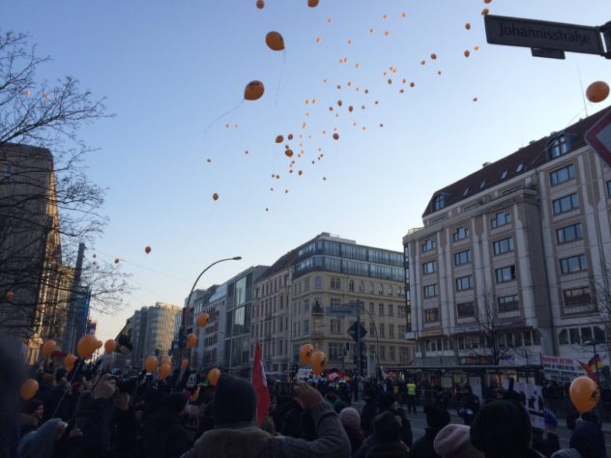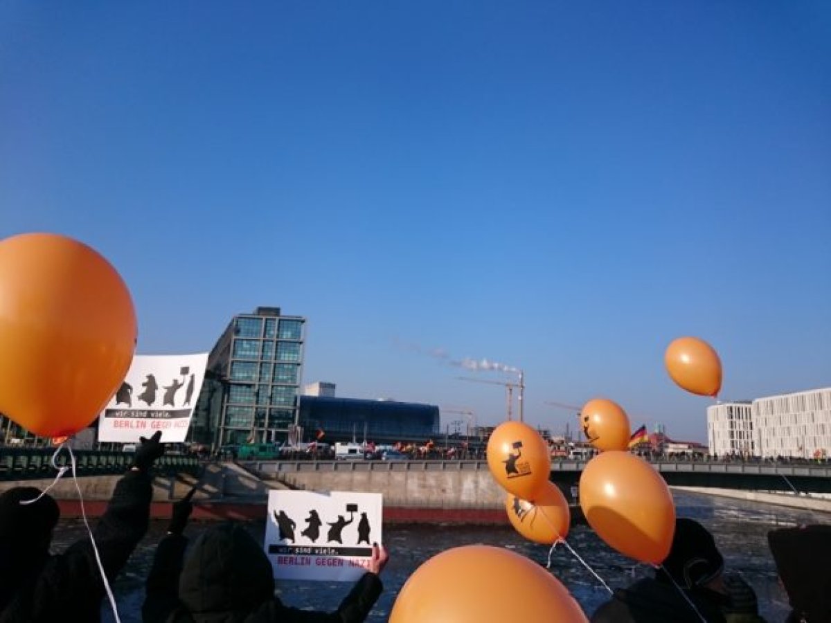 Berlin gegen Nazis bot auf beiden Kundgebung eine Mitmach-Aktion mit Luftballons für alle Berliner_innen an. Bei Sonnenschein und klirrender Kälte stiegen nach einem Countdown hunderte Luftballons mit dem Aufdruck "Berlin gegen Nazis" in den blauen Berliner Himmel auf als der rechtsextreme Aufmarsch die Kundgebungen passierte. In der Videodokumentation vom Jüdischen Forum für Demokratie und gegen Antisemitismus des rechtsextremen Aufmarsches und der Proteste ist die Luftballonaktion im Spreebogenpark im Bewegtbild festgehalten.