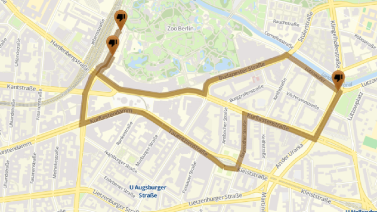 „Hand in Hand“-Aufmarsch ab 14.00 Uhr - Startpunkt: Hardenbergplatz (nördlicher Bereich) – Joachimsthaler Straße – Kurfürstendamm – Tauentzienstraße – Wittenbergplatz – Bayreuther Straße – Kurfürstenstraße – Schillstraße – Zwischenkundgebung: Lützowplatz – Lützowufer – Budapester Straße – Hardenbergstraße – Endpunkt: Hardenbergplatz