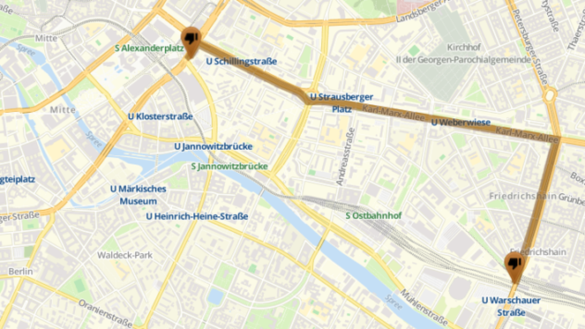 Angemeldet ist dieser Aufmarsch von 17.30 Uhr – 23.59 Uhr auf folgender Route: Alexanderstraße (Haus des Lehrers/bcc) - Karl-Marx-Allee - Warschauer Straße - Endpunkt: S Warschauer Straße