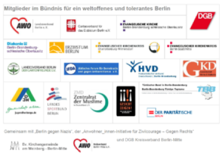 Das Bündnis für ein weltoffenes und tolerantes Berlin, ein Bündnis von Kirchen, Gewerkschaften, Wohlfahrtsverbänden und weiteren zivilgesellschaftlichen Organisationen unterstützt die Anwohnerinitiative organisatorisch und ruft ebenfalls zur Teilnahme an der Kundgebung auf.