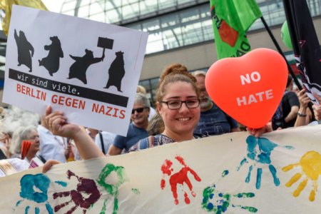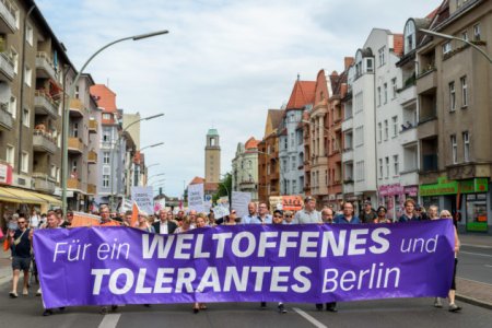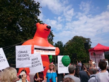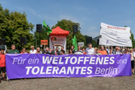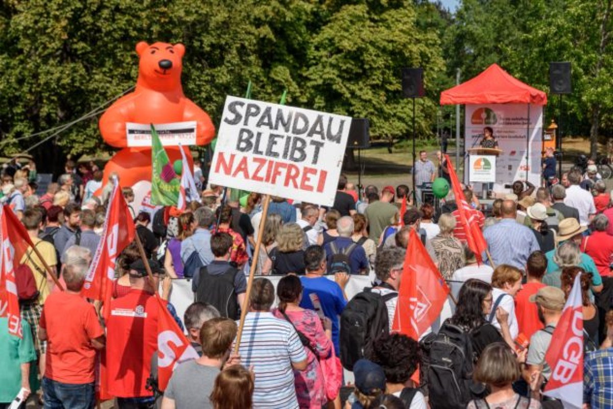 Um 10.30 Uhr folgte eine große Kundgebung gegenüber dem Spandauer Rathaus mit über 1000 Teilnehmer_innen organisiert durch das Bündnis für ein weltoffenes und tolerantes Berlinmit Redebeiträgen von Lala Süsskind, Vorsitzende Jüdisches Forum für Demokratie und gegen Antisemitismus, Bischof Dr. Markus Dröge, Evangelische Kirche, Prälat Dr. Stefan Dybowski, Katholische Kirche, Ayşe Demir, Vorstandssprecherin des Türkischen Bundes in Berlin-Brandenburg, Christian Hoßbach, Vorsitzender DGB Berlin-Brandenburg und Jan Gabriel, Präsident Humanistischer Verband Berlin-Brandenburg.