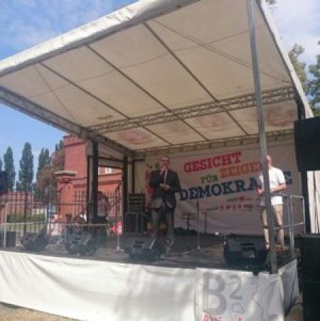 An der Wilhelmstraße 23 fand über den gesamten Nachmittag ein gutes besuchtes Fest der Demokratie mit Infoständen, Reden und Musik statt, zu dem die Spandauer Ortverbände der Parteien SPD, CDU, der Grünen, der Linken und der FDP unterstützt u.a. vom DGB, Ver.di, IG Metall Jugend, Volksolidarität, AWO, den Naturfreunden, dem Bezirksschülerausschuss Spandau und der Partnerschaft für Demokratie Spandau aufgerufen hatten. Das Fest Fwurde von organisiert von B²Aktion+. Es sprach unter anderem der Bezirksbürgermeister von Spandau Herr Kleebank, sowie Parteienvertreter_innen und erneut der Evangelische Bischof Herr Dröge und der Vorsitzende des DGB Berlin Brandenburg Herr Hoßbach.