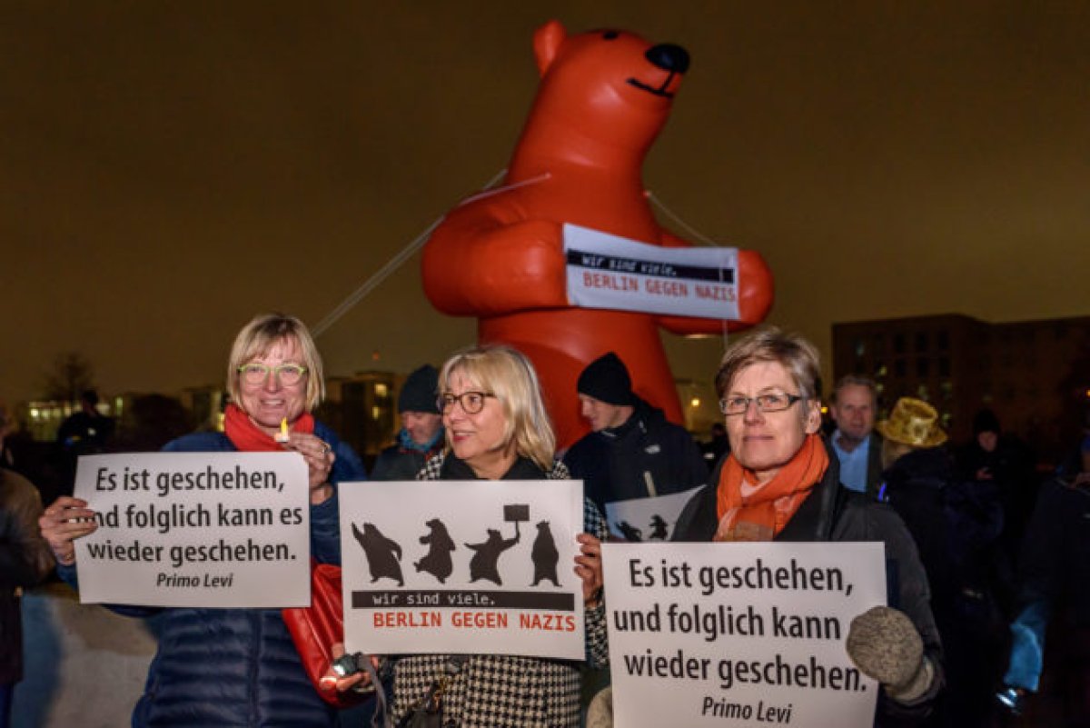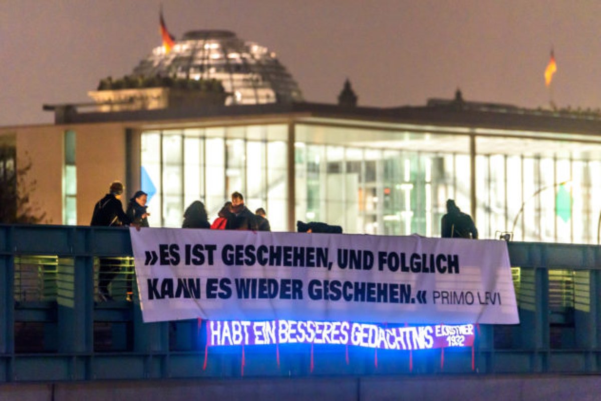 Zugleich führte das Bündnis für ein weltoffenes und tolerantes Berlin gemeinsam mit Berlin gegen Nazis eine Riesenbanneraktion mit der Banner-Aufschrift „Es ist geschehen, und folglich kann es wieder geschehen (Primo Levi)“ in Sichtweite des rechtsextremen Aufmarsches durch und verteilte Schilder mit dem Zitat als Mitmachmöglichkeit für alle, die keine eigenen Schilder mitgebracht hatten. Eine einzelnen Engagierte steuerte für die Banneraktion ein zweites Banner aus Rettungsdecken mit einem Zitat von Erich Kästner „Habt ein besseres Gedächtnis“ bei.