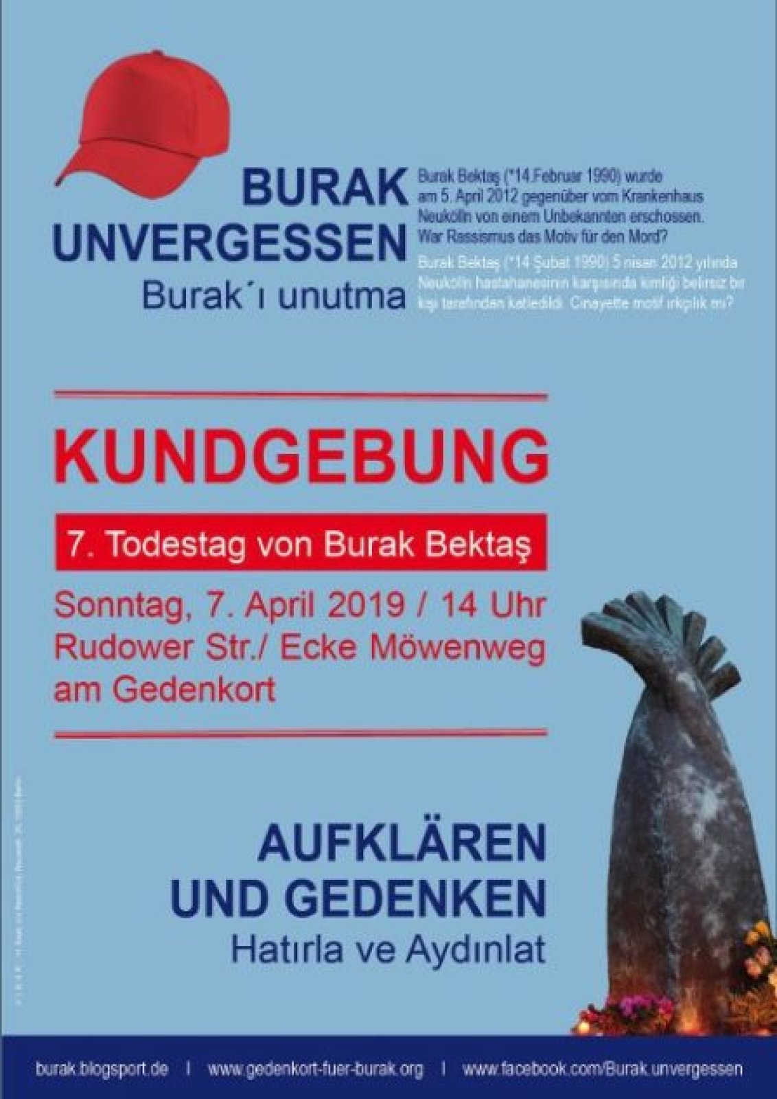 Gemeinsam mit Familie Bektaş, sowie seinen Freundinnen und Freunden erinnern und gedenken wir Burak. Wir klagen an und fordern Aufklärung. Noch immer liegen keine Ermittlungsergebnisse vor. Es bestätigt sich vielmehr die Annahme, dass keine ernstzunehmenden Ermittlungen durchgeführt wurden.