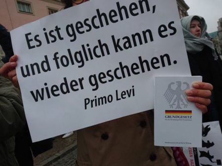 Mitmach-Aktion: Mit Grundgesetzen gegen Reichsbürger - 09.11.19, Bebelplatz Foto: Berlin gegen NazisNeben dem Gedenken positionierten sich die Teilnehmer_innen der Kundgebung auf dem Bebelplatz gegen den vorbeilaufenden Reichsbürgeraufmarsch mit ca. 130 Personen. Auf diesem Aufmarsch äußerten Redner offenen Antisemitismus und Verschwörungsideologien. Reichsbürger glauben u.a. die BRD sei eine Firma und das Grundgesetz nicht gültig. Neben Transparenten und Bannern hielten die Teilnehmer_innen dem Reichsbürgeraufmarsch daher das Grundgesetz entgegen. Viele Menschen protestierten direkt an der Auftaktkundgebung der Reichsbürger und es gab durchgehenden Gegenprotest im gesamten Streckenverlauf des Aufmarsches.