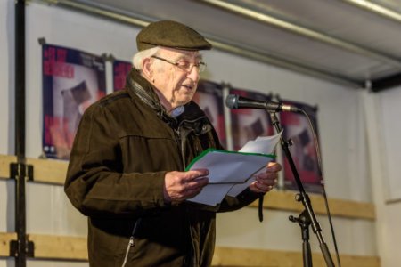 Rede von Peter Neuhof am Mahnmal Levetzovstraße auf der Kundgebung vom VVN-BdA Berlin - Berlin, 09.11.2019, Foto: Florian BoillotAm Abend fanden die seit 1990 jährlich am 9. November von der Berliner Vereinigung der Verfolgten des Naziregimes/Bund der Antifaschistinnen und Antifaschisten-VVN-BdA organisierten Gedenkaktionen in Moabit statt. Auf der Gedenkkundgebung "Es ist geschehen, und folglich kann es wieder geschehen" (Primo Levi) , sprach der 1925 geborene Peter Neuhof. Zum Ende der Gedenkkundgebung legten Menschen Rosen am Mahnmal Levetzowstrasse nieder. Im Anschluß begann die antifaschistische Gedenkdemonstration mit ca. 900 Teilnehmer_innen zum Deportationsdenkmal auf der Putlitzbrücke, von wo aus Jüdinnen und Juden 1942 deportiert wurden. Die Demonstration legte den letzten Teil der Wegstrecke schweigend zurück und auch am Mahnmal Putlitzbrücke wurden zum Gedenken Blumen niedergelegt.