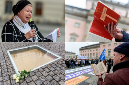Über 250 Teilnehmer_innen gedachten und protestieren auf der Kundgebung vom Bündnis für ein weltoffenes und tolerantes Berlin am Bebelplatz. Die Gedenklesung unter dem Motto "Für ein würdiges Gedenken" wurde ihrem Motto sehr gerecht. Mit Lesungen aus Büchern von vielen Autor_innen, deren Bücher 1933 an diesem Ort von Nazis verbrannt wurden, konnte der Bebelplatz an der Aufmarschroute der Reichsbürger trotz schlechtem Wetter mehre Stunden belegt und ein aktives Gedenken mit Gestaltungsmöglichkeiten für alle Teilnehmenden stattfinden. Die Pogromnacht von 1938 hat eine nationalsozialistische Vorgeschichte, in der die Bücherverbrennung eine zentrale Rolle spielte. 5 Jahre nach 1933 brannten am 9. November Synagogen. Berliner_innen, Vertreter_innen der Mitgliedsorganisationen vom Bündnis Berlin, die Omas gegen Rechts Berlin, die Anwohner_inneninititive für Zivilcourage - Gegen Rechts aus Mitte und viele andere, brachten Bücher mit und füllten das Kundgebungsprogramm durch eigene Beiträge.