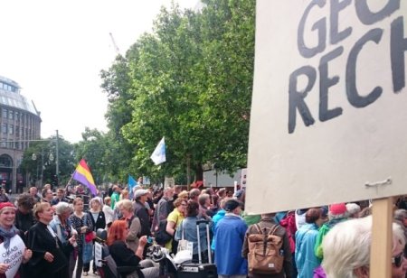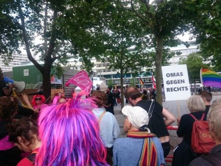 Protest der Omas gegen Rechts Berlin, 14.07.2019 - Foto: Berlin gegen NazisDie Omas gegen Rechts Berlin setzten am 14. Juli der rechtsextremen Kundgebung einen großartigen Protest mit Musik und "Salsatanz gegen Rechts" entgegen. Mit Unterstützung von Jogida, der Jodeloffensive gegen die Idiotisierung durch Angst wurden die völkischen Tänze und Reden mit stundenlangen Jodeln übertönt. Zum Beginn der Kundgebung sprach die Superintendentin der EKBO ein Friedensgebet auf der Kundgebung der Omas gegen Rechts Berlin. Das Gockenläuten der Kaiser-Wilhelm-Gedächtniskirche zur Umrahmung des Gebets verunmöglichte zeitweise die Reden auf der rechtsextremen Kundgebung. Zugleich positionierte sich die Gemeinde der Gedächtniskirche mit zwei Bannern des Bündnis für ein weltoffenes und tolerantes Berlin, einem Berlin gegen Nazis-Banner und einem Banner der Kampagne "Hass schadet der Seele – Liebe tut der Seele gut". Über der rechtsextremen Kundgebung mit Reden von verurteilten Holocaustleugnern hing so als Mahnung ein Zitat von Primo Levi: "Es ist geschehen, und folglich kann es wieder geschehen."