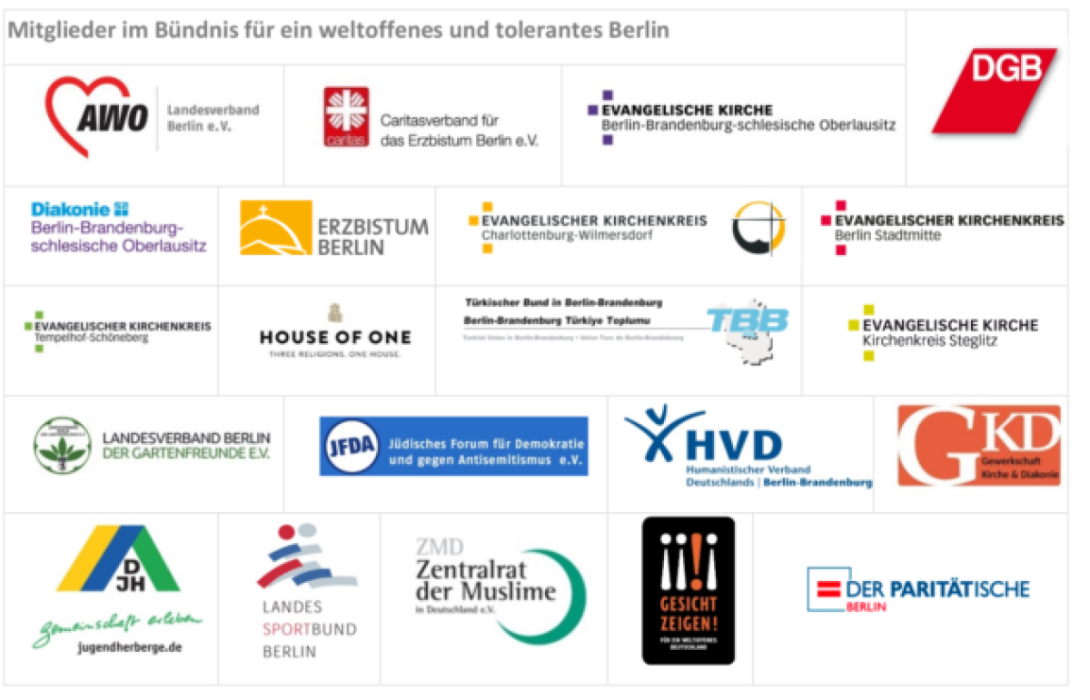 Mitglieder Bündnis für ein weltoffenes und tolerantes BerlinDas Bündnis für ein weltoffenes und tolerantes Berlin, ein Bündnis von Kirchen, Gewerkschaften, Wohlfahrtsverbänden und weiteren zivilgesellschaftlichen Organisationen hat zu dieser Kundgebung einen Aufruf (Facebook) veröffentlicht, dort heißt es u.a.: