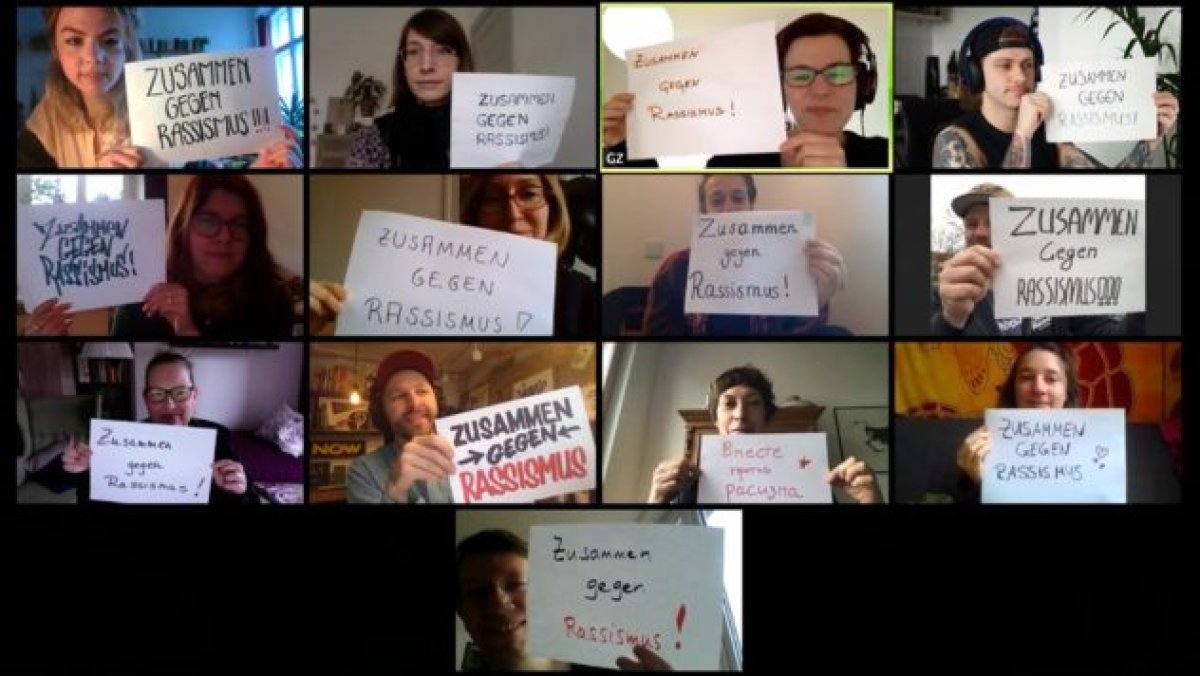 Ein Beispiel einer Videokonferenz mit gleichzeitiger gemeinsamer Positionierung: Gesicht zeigen! #ZUSAMMENGEGENRASSISMUSNeben der Positionierung selbst steht auch die Koordination eben dieser vor immensen Herausforderungen. In aller Munde sind Videochats und Online-Konferenzen. Auch Bündnis-Treffen können so weiterhin regelmäßig stattfinden. Es bleibt wichtig zusammen zu finden und sich auszutauschen. Doch wie kann das jede_r Einzelne von zu Hause aus realisieren? Voraussetzung ist der Zugriff auf einen Laptop oder PC mit Mikrofon/Lautsprecher und einer Kamera. In den meisten Laptops sind diese serienmäßig verbaut. Außerdem ist ein funktionierender Internetzugang unumgänglich. Neben gängigen Anbietern wie Skype existieren auch verschiedene Open-Source Plattformen. Zu nennen wären hier Jitsi, Nextcloud oder Signal. Diese Plattformen zeichnen sich dadurch aus, dass sie sehr wenige Daten sammeln und so ein größtmögliches Maß an Privatsphäre bereit halten.