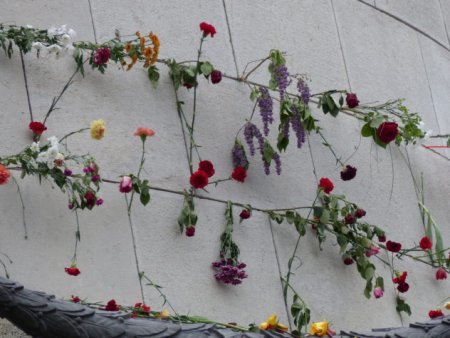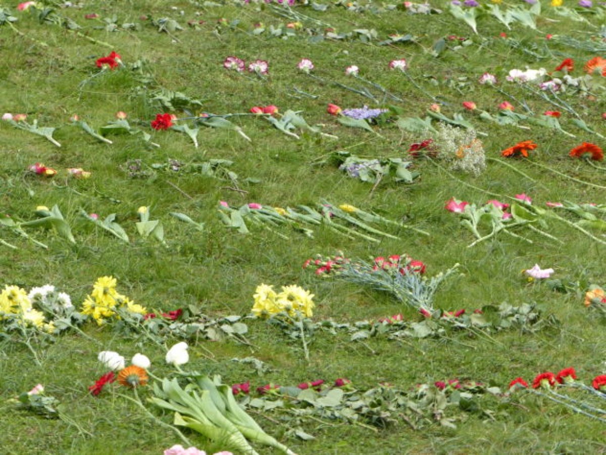 Blumen am Sowjetischen Ehrenmal im Treptower Park - Foto: Berlin gegen NazisDie Vereinigung der Verfolgten des Naziregimes - Bund der Antifaschistinnen und Antifafaschisten (VVN-BdA) reagiert auf die momentane Situation mit Aufrufen zu individuellem Gedenken. Das traditionelle Fest am 9. Mai neben dem sowjetischen Ehrenmal musste in diesem Jahr abgesagt werden.