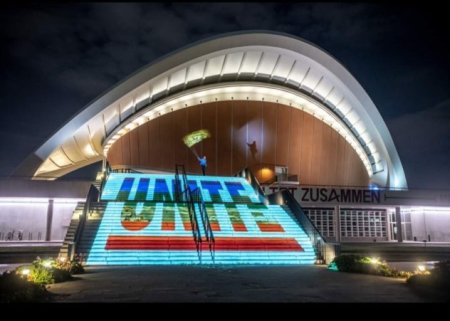 Lichtinstallation von Die Vielen vor dem Haus der Kulturen der Welt -Foto: Die VielenAm 8. Mai ist der GLÄNZENDE LIVE_STREAM #1 von 18 bis 24 Uhr (Facebook) geschaltet. Mit Beiträgen der über 4.400 Unterzeichner*innen der Erklärungen der Vielen in Deutschland und Österreich werden Fragen nach dem Feiertag, der Erinnerung an die Befreiung, der Zeugenschaft und vielem anderen mehr besprochen und diskutiert. "An beiden Tagen werden DIE VIELEN in über 35 Städten in Deutschland und Österreich regionale Aktionen für eine Gesellschaft von morgen realisieren und sich online und offline mit Projektionen und goldenen Fahnen an Fassaden, glitzernden Webseiten und goldenen Social- Media-Kanälen gegen den Hass und für die SCHÖNHEIT DER VIELFALT einsetzen."