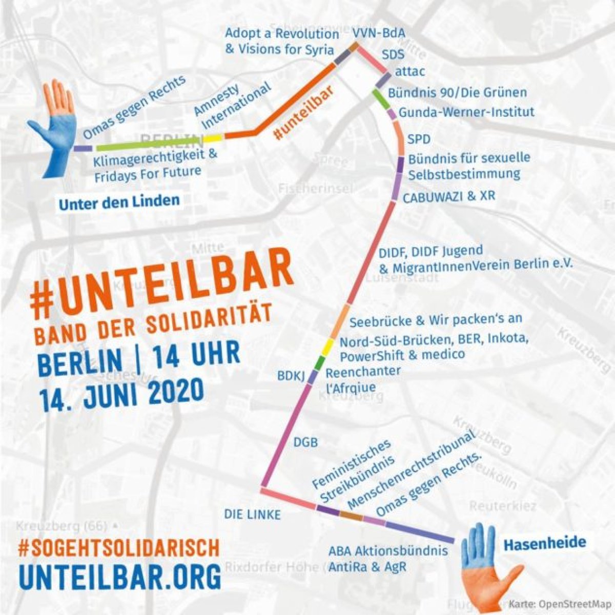 Das Band der Solidarität zieht sich als Aneinanderreihung von Kundgebungen durch die Innenstadtbezirke Berlins. Landesweit finden Kundgebungen nach dem gleichen Vorbild statt. So verbindet dieses Band der Solidarität symbolisch die Bewohner_innen und Engagierten in Städten in ganz Deutschland. Mit diesem Statement will das Bündnis #unteilbar am Aktionstag am Sonntag, den 14. Juni unter dem Motto #SoGehtSolidarisch darauf aufmerksam machen, dass die Herausforderungen der Pandemie nur gemeinsam zu bewältigen sind. #unteilbar und alle Unterstützer_innen setzten damit auch ein deutliches Zeichen gegen Rassismus, Ausgrenzung und Verschwörungserzählungen.