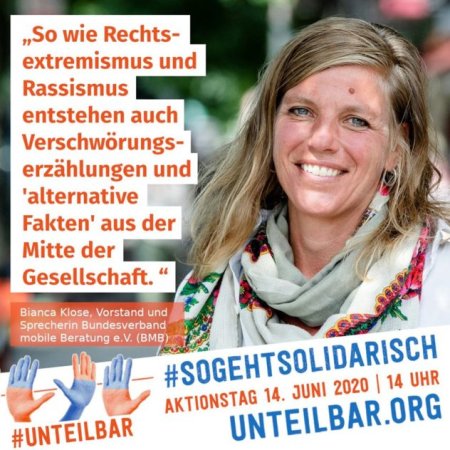 Bianca Klose ist Vorstand und Sprecherin im Bundesverband mobile Beratung e.V. Sie unterstützt das Bündnis #unteilbar und das Band der Solidarität. "So wie Rechtsextremismus und Rassismus entstehen auch Verschwörungserzählungen und 'alternative Fakten' in der Mitte der Gesellschaft."
