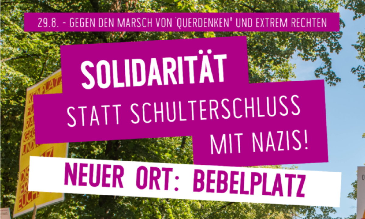 Aufgrund der unklaren Sicherheitslage nach der Verbotsverfügung der „Querdenken“-Demos am 29. August und der undurchsichtigen Polizeitaktik können wir keinen sicheren Zugang zum Simsonweg mehr gewährleisten. Hinzu kommen diverse Drohungen von Nazis und „Querdenkern“, unsere Kundgebung am Simsonweg zu überfallen oder „infiltrieren“. Als Ausweichort unseres Protestes haben wir den Bebelplatz gewählt