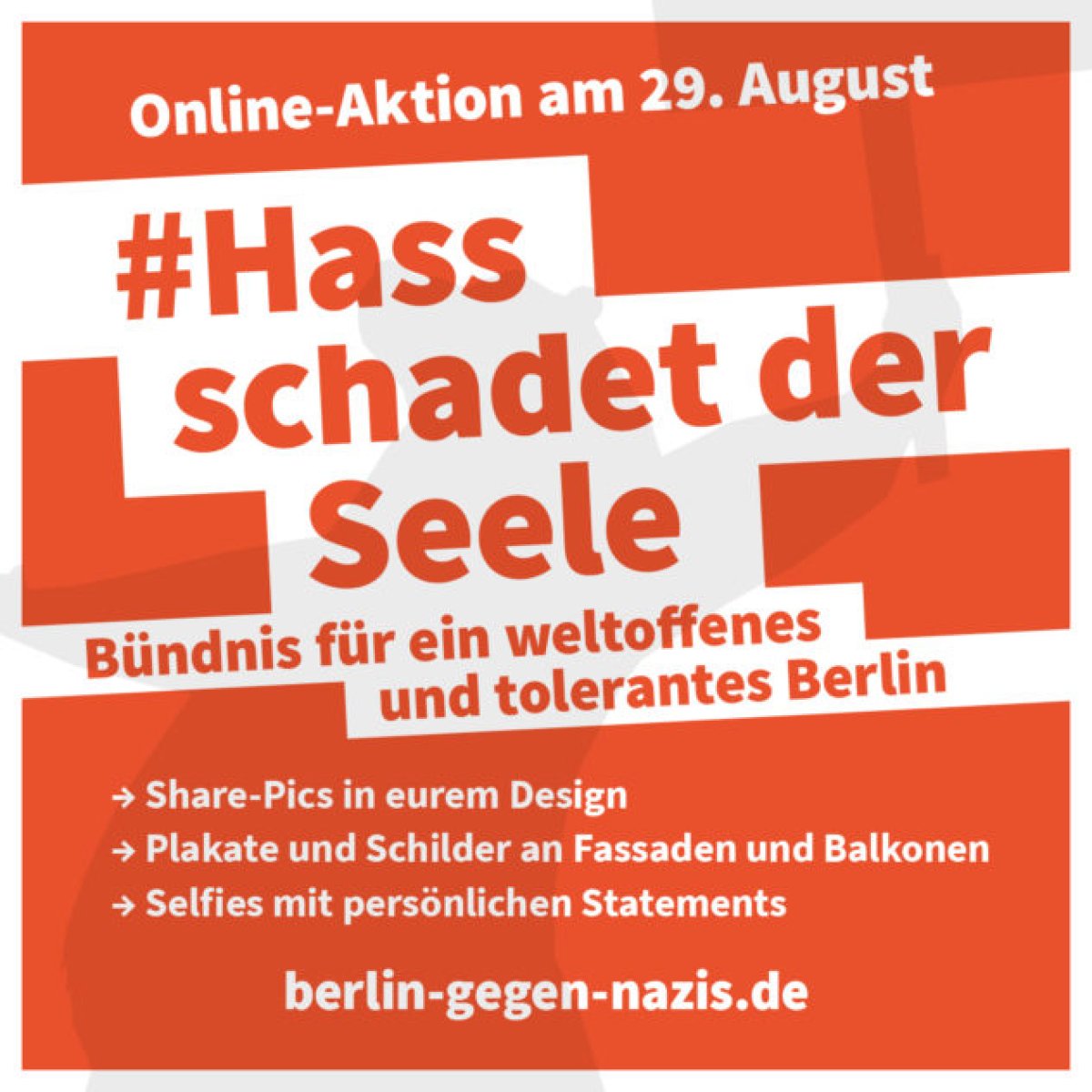 Positionierungen und Proteste um den 29.08.Das Bündnis für ein weltoffenes und tolerantes Berlin ruft mit einem Aufruf mit dem Titel "Abstand halten gegen Rechts - Hass schadet uns allen" zu einer berlinweiten Positionierungsaktion auf. Unter den Hashtags #b2908 #AbstandhaltengegenRechts und #HassschadetderSeele sollen sich die Berliner_innen gegen die verschwörungsideologische Bündnisdemonstration positionieren, indem sie Banner aufhängen, diese fotografieren und auf Social Media Kanälen teilen. Im Aufruf heißt es u.a.: