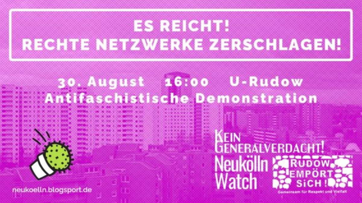 Die Rudower Initiative Rudow empört sich! Gemeinsam für Respekt und Vielfalt mobilisiert zusammen mit weiteren Initiativen am Sonntag, den 30. August 2020 zu einer antifaschistischen Demonstration unter dem Motto auf. Der Treffpunkt ist um 16 Uhr am U-Bahnhof Rudow.