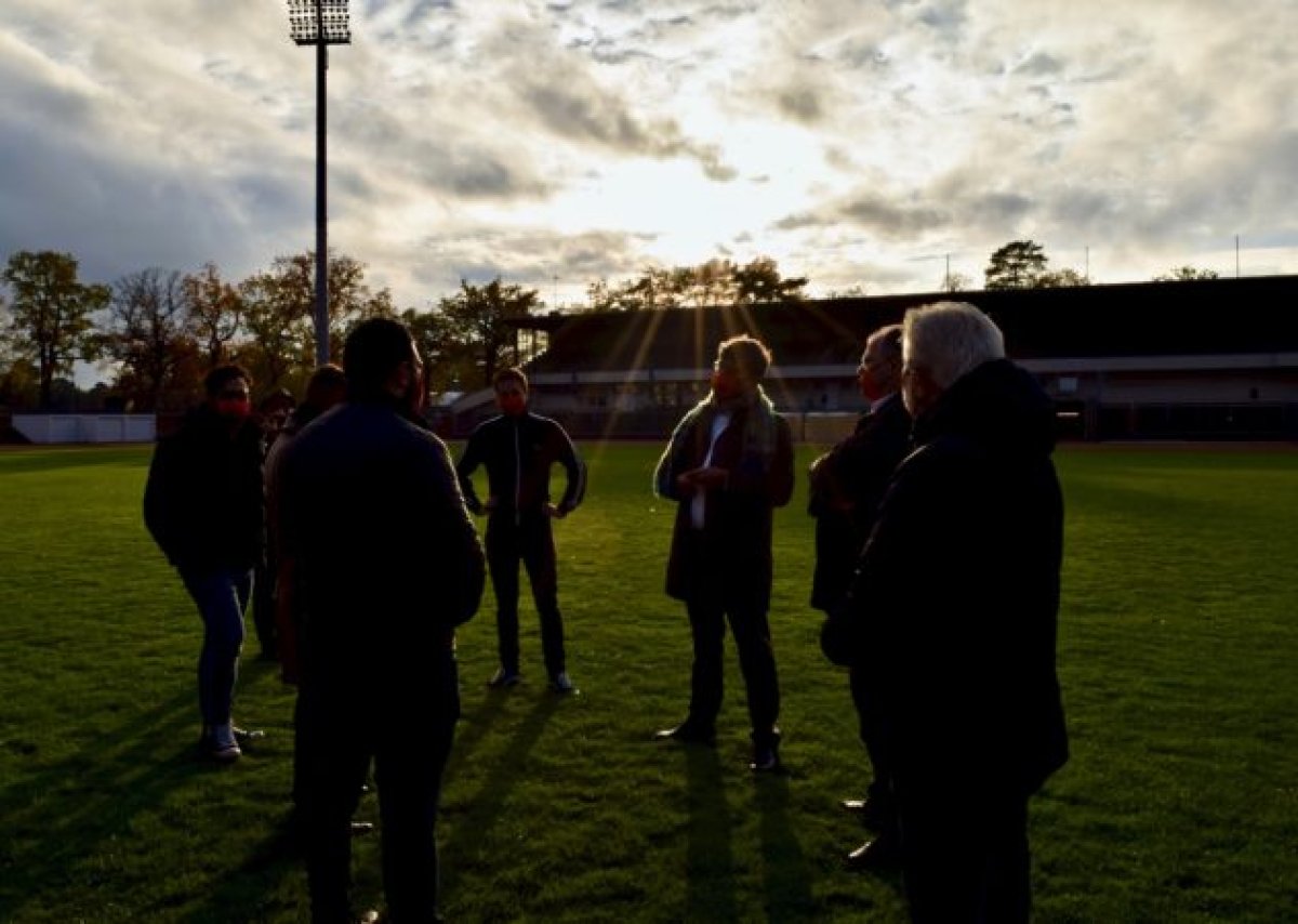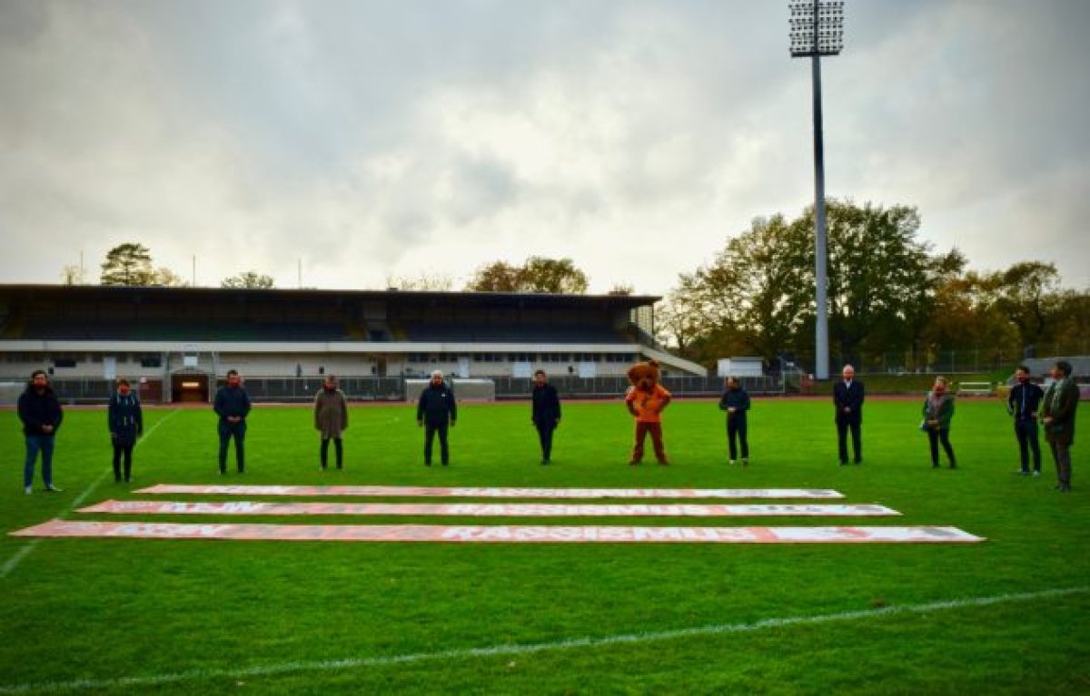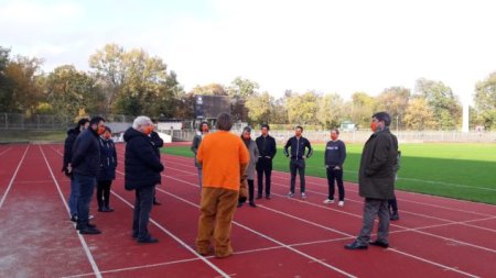 Positionierungsvorbereitungen und Fachgespräche aller Beteiligten am 1.November. - Foto: Berlin gegen NazisBFV und Berlin gegen Nazis war es aber auch sehr wichtig, noch im Jahr 2020 ein Ausrufezeichen zur Kampagne zu setzen. So wurden, trotz eines Covid-19-Falls in der Mannschaft von Tennis Boussia Berlin und der Absage des Spiels gegen den Berliner AK am 1. November, die laufenden Vorbereitungen für ein Fotoshooting im nun leeren Mommsenstadion genutzt. Das Ergebnis ist eine tolle Positionierung, mit Abstand, unter dem Motto #KEINPLATZFÜRRASSISMUS.
