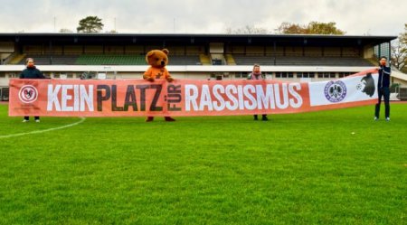 Plüschbär mit den Gastgebern von Tebe und dem Justizsenator & dem BFV - Foto:Berlin gegen NazisNach ersten Positionierungen des BFV und mehrerer Vereine auf der unteilbar-Demonstration "Band der Solidarität" im Juni diesen Jahres und einer LED-Bandenwerbungsaktion beim nachgeholten Landespokalfinale im August, sollte die Kampagne #KEINPLATZFÜRRASSISMUS im November richtig starten (weitere Informationen zur Kampagne deutsch, englisch und türkisch ). Zwanzig Banner mit dem jeweiligen Vereinslogo der zwanzig Vereine, die sich bisher an der Kampagne beteiligen, sind produziert. Nach der Auftaktaktion am 1. November im Rahmen des Regionalligaspiels Tennis Borussia Berlin vs. Berliner AK 07 im Mommsenstadion sollten alle weiteren an den darauf folgenden Wochenenden mit vielen Positionierungen auf Amateurfußballplätzen in Berlin übergeben werden, um diese dann dauerhaft an den Plätzen zu hängen.