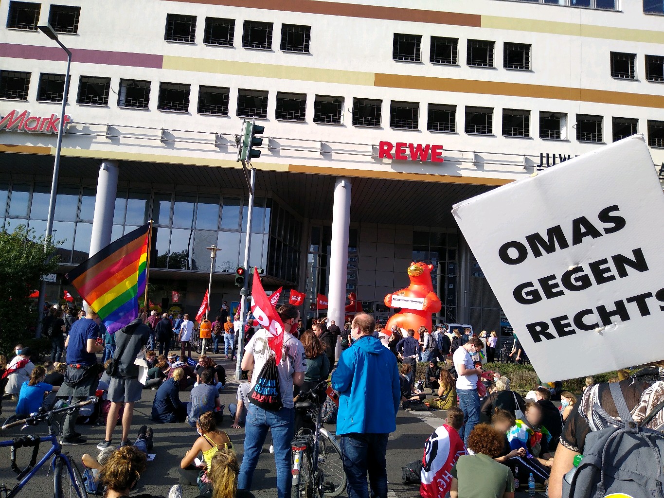 Foto: Florian Boillot/ Berlin gegen NazisFoto: Berlin gegen NazisFoto: Berlin gegen NaziFoto: Berlin gegen NaziGegenprotest mit eine Kundgebung von Berlin Gegen Nazis am Linden Center: Omas gegen Rechts und Bärin Etwas 250 Neonazis protestieren mit einem Aufmarsch des rechtsextremistischen Kleinpartei III. Weg durch Berlin-Hohenschönhausen ab den S-Bahnhof Wartenberg. Trotz stark Polizeipräsenz musste die Route der Demonstration der Nationalsozialisten gekürzt werden, wegen starken Proteste der Zivilgesellschaft und Blockade der Antifa.Das Berliner Bündnis gegen Rechts und ein Bündnis um die Berliner Vereinigung der Verfolgten des Nazisregimes - Bund der Antifaschistinnen VVN/BdA positionierten sich mit weiteren Kundgebungen direkt an der geplanten Aufmarschroute der Neonazis im Ostsee-Viertel, die von vielen Teilnehmenden an den Gegenprotesten angesteuert wurden. Ein großer Teil dieser Menschen entschloss sich spontan auf der Aufmarschroute zu protestieren. Nach stundenlanger Wartezeit konnten die Neonazis daher nur 500m auf der geplanten Route marschieren. Nach weiterem langem Warten, liefen wenigen hundert Rechtsextremen schlussendlich über eine kurze Ausweichstrecke und abgelegene Parkstraßen zurück zum Ausgangspunkt am S-Bahnhof Wartenberg.