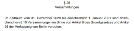 Das beim Bund-Länder-Gipfel vereinbarte Versammlungsverbot für den 31.12.2020 + 01.01.2021 ist für Berlin seit dem 16.12. umgesetzt. In der neuesten Version der Berliner Infektionsschutzverordnung regelt §26 diese temporäre Grundrechtseinschränkung.