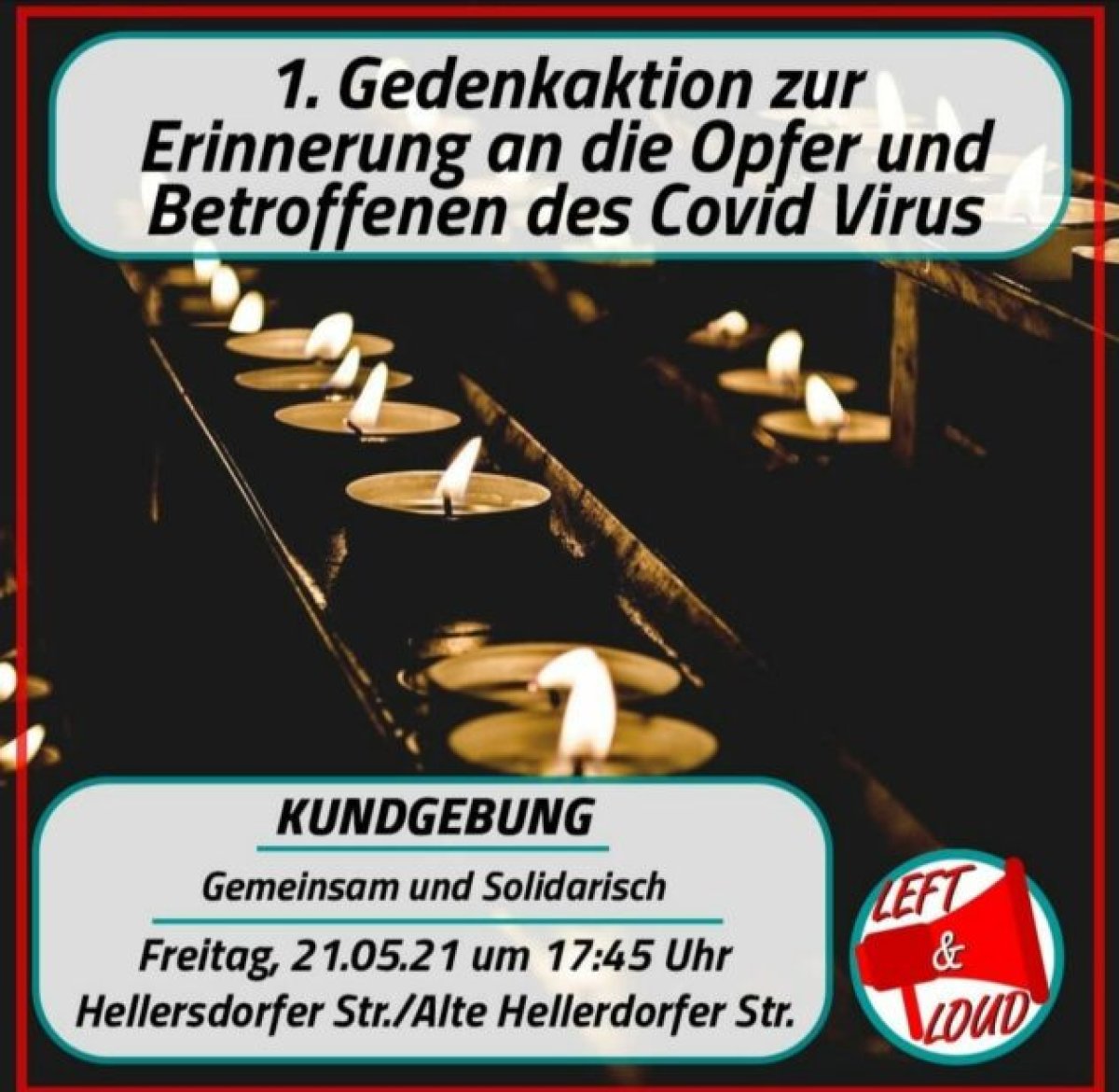 Protestauftakt: Hellersdorfer Str.(Alte Hellersdorfer Str.,17.45 Uhr Gedenken an die Opfer und Betroffenen der Covid-Pandemie in Marzahn-Hellersdorf. Seit Anfang März protestieren junge Engagierte aus dem Bezirk jeden Freitag am Auftaktort des verschwörungsideologischen Autokorso Ost. An diesem Freitag wird dieser Protest zu einer Gedenkkundgebung für die an COVID gestorbenen Menschen aus Marzahn Hellersdorf. In der Nähe wird gegen 18 Uhr erneut ein Autokorso starten.