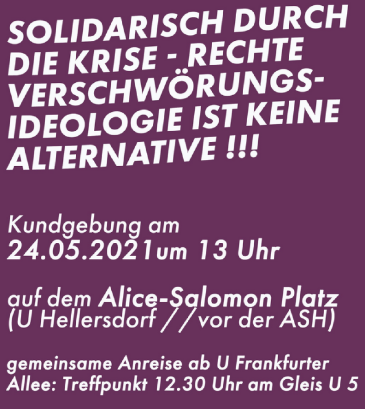 - 13.00 - 18.00 Uhr (beworben für 14 Uhr) verschwörungsideologische Kundgebung, Alice-Salomon-Platz