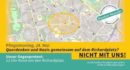 Flyer Bündnis NeuköllnFür Pfingstmontag 24. Mai hat sich um das Bündnis Neukölln eine breite bezirkliche Gegenprotestvernetzung gebildet. Um 10 Uhr wird es einen Gegenprotestauftakt am Rathaus Neukölln geben. Um 12 Uhr starten mehrere Gegenproteste am Richardplatz, wo auch die verschwörungsideologische Kundgebung ab 13 Uhr angemeldet ist und für 14 Uhr beworben wird. Im Aufruf zum Gegenprotest unter dem Motto "Querdenken und Nazis gemeinsam auf dem Richardplatz? NICHT MIT UNS" heißt es u.a.:
