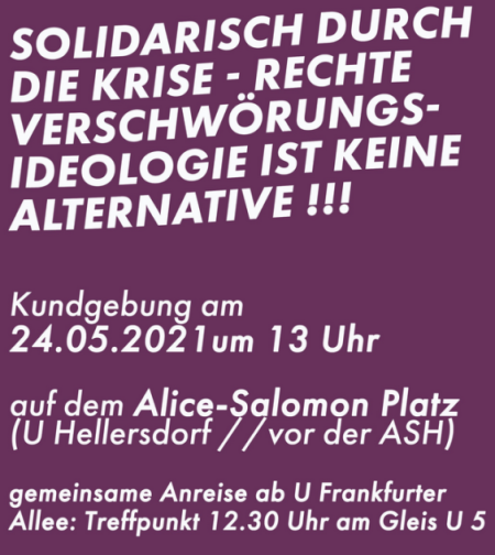 Ein Bündnis aus linken Initiativen, u.a. dem Asta der ASH und der Initiative Left & Loud, die seit Wochen Gegenproteste gegen die verschwörungsideologischen Autokorsos im Bezirk organisiert ruft zum Gegenprotest auf dem Alice-Salomon-Platz (Seite Alice-Salomon-Hochschule) in Marzahn-Hellersdorf auf. Der Protest gegen die verschwörungsideologische Kundgebung am Pfingstmontag startet um 13 Uhr.