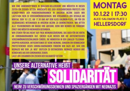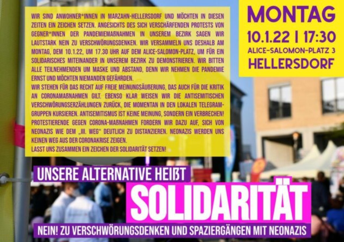 Das Bündnis für Demokratie und Toleranz Marzahn-Hellersdorf ruft gemeinsam mit Anwohner_innen zum Protest gegen die verschwörungsideologischen "Montagssdemonstrationen in Marzahn-Hellersdorf auf. Das Bündnis Das Bündnis setzt sich aus unterschiedlichsten Vereinen, Parteien, Institutionen, Unternehmen, Initiativen und Gewerkschaften aus dem Bezirk zusammen, die sich für ein vielfältiges Marzahn-Hellersdorf einsetzen. Zum Jahresbeginn 2021 startete dieses Bündnis einen Aufruf gegen verschwörungsideologische Autokorsos, der kurz darauf in bezirksübergreifende Proteste mündete.