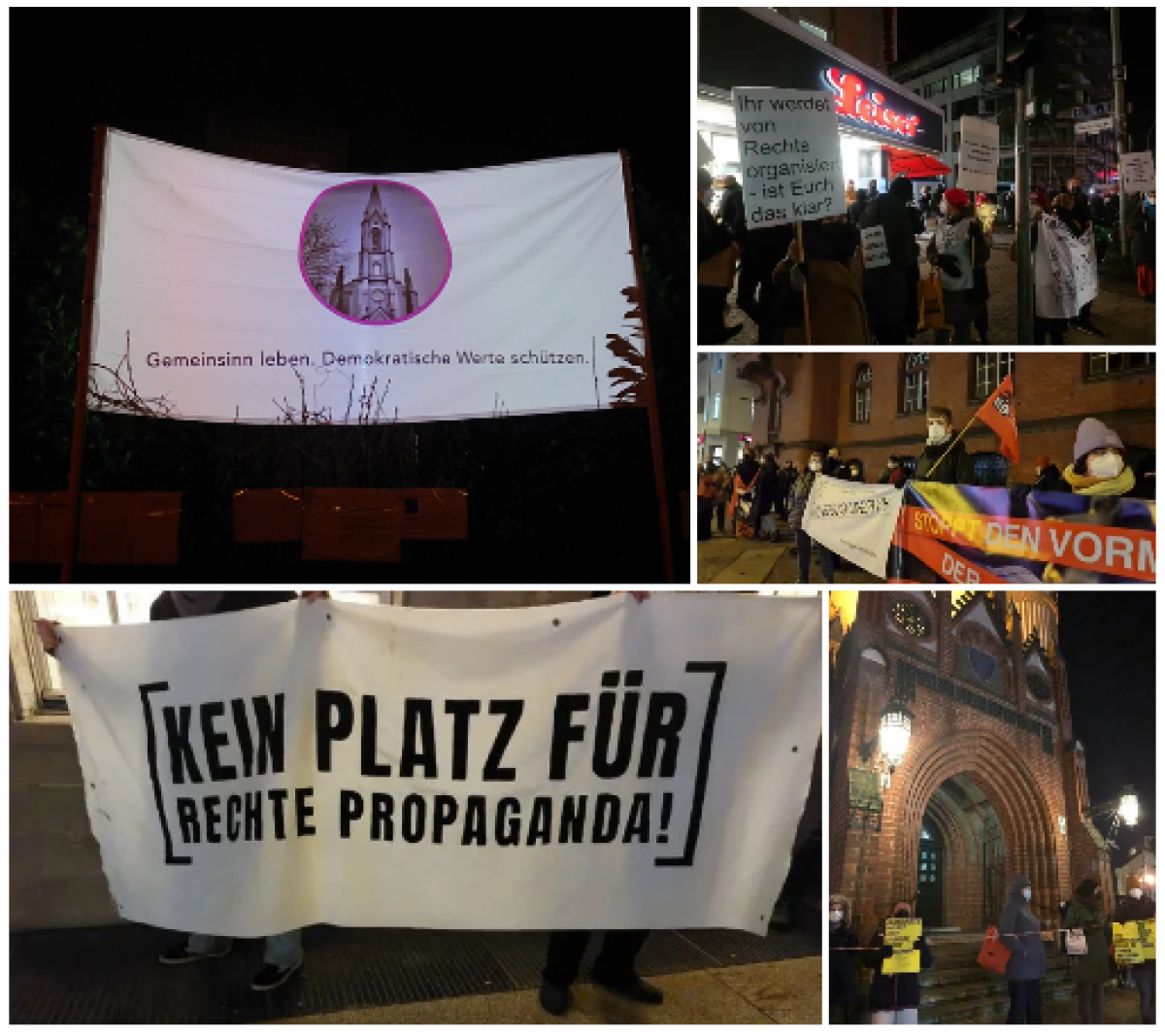 Die vom Geradenken-Kollektiv am 3.01 gestarteten Proteste vor dem Rathaus Neukölln, werden seit dem 10.01 wöchentlich von unterschiedlichen Initiativen aus dem Bündnis Neukölln und aus dem Umfeld von Aufstehen gegen Rassismus weitergeführt. Eine Kooperation, wie schon beim Protest am 8. Januar am Hermannplatz gegen einen verschwörungsideologischen Autokorso.Das Bündnis Neukölln, ist ein breites Bezirksbündnis verschiedenster Organisation mit eigenem Leitbild und veranstaltet unter anderem das Festival Offenes Neukölln.