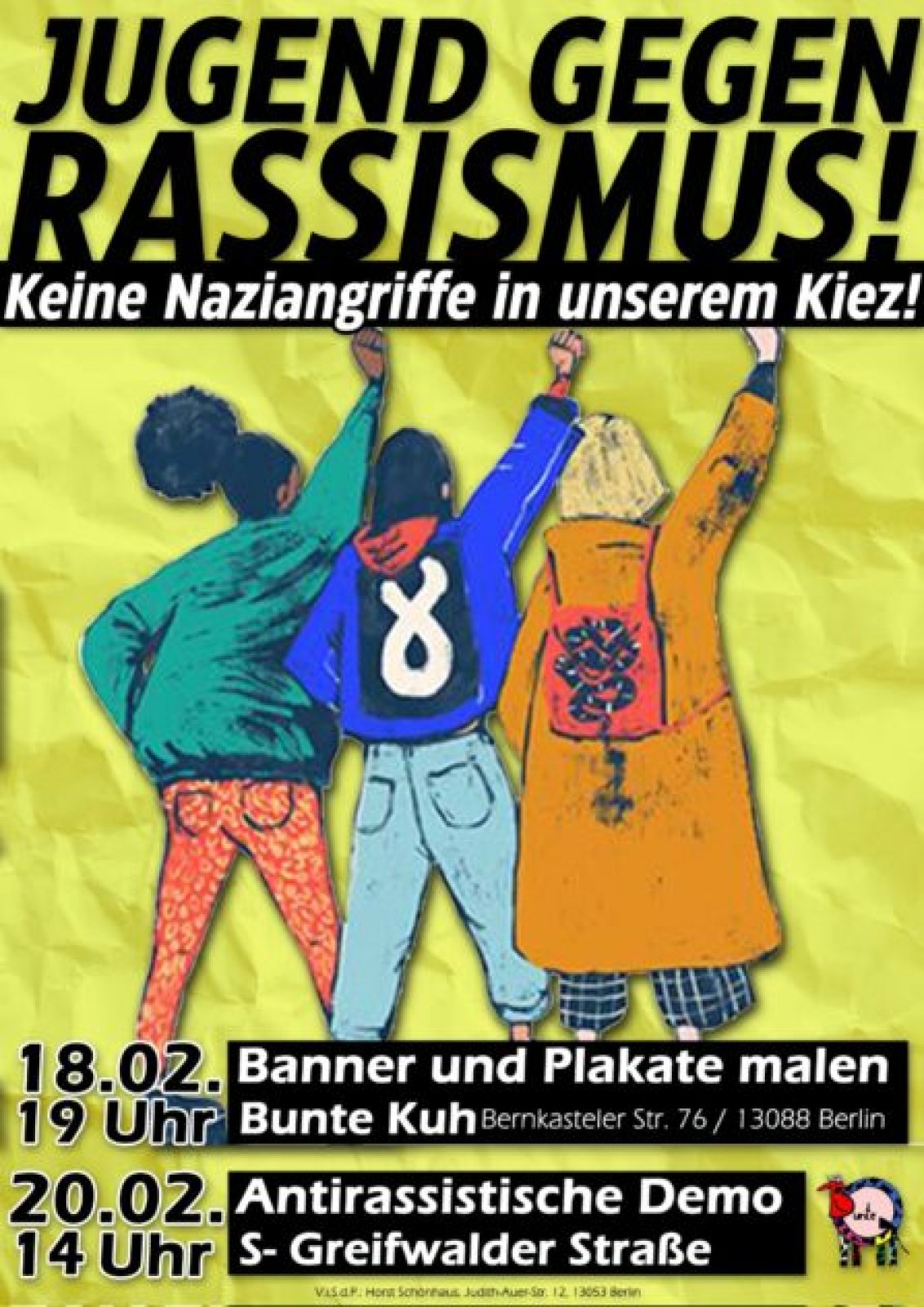 Unter dem Titel "Schau nicht weg! Solidarität mit allen Opfern rassistischer Gewalt! Solidarität mit Dilan!" ruft ein antirassisisches Bündnis für Sonntag, den 20.02.22 um 14:00 Uhr zu einer Solidaritätsdemonstration auf. Treffpunkt ist der S-Bahnhof Greifswalder Straße.