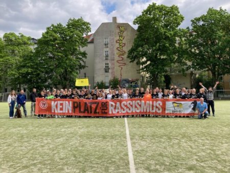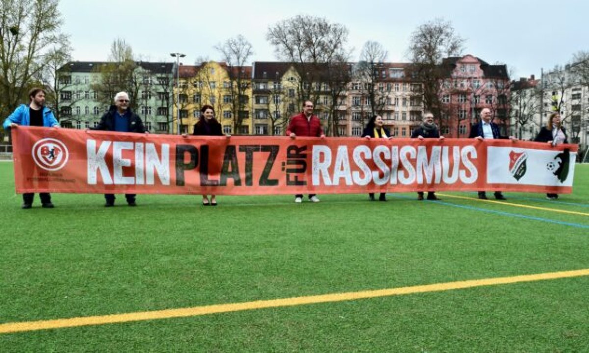Wilmersdorf - 26.03.2022 - Sport gegen RassismusDer 1. FC Wilmersdorf 1911 e V positioniert sich wie viele andere Vereine dauerhaft mit einem eigenen #KEINPLATZFÜRRASSISMUS Banner. Das tolle Positionierungsfoto entstand am 26. März im Rahmen der Veranstaltung "Sport gegen Rassismus" aus Anlass der Aktionswochen gegen Rassismus in Charlottenburg-Wilmersdorf. Veranstaltet vom Nachbarschaftszentrum Divan e.V., Iranische Gemeinde in Deutschland und dem 1. FC Wilmersdorf. Hier waren auch die Kollge_innen der MBR Berlin für gespräche mit Vereinsmitgliedern, Bezirkspolitiker_innen und Ana-Maria Trăsnea (Staatssekretärin für Engagement-, Demokratieförderung und Internationales) vor Ort.