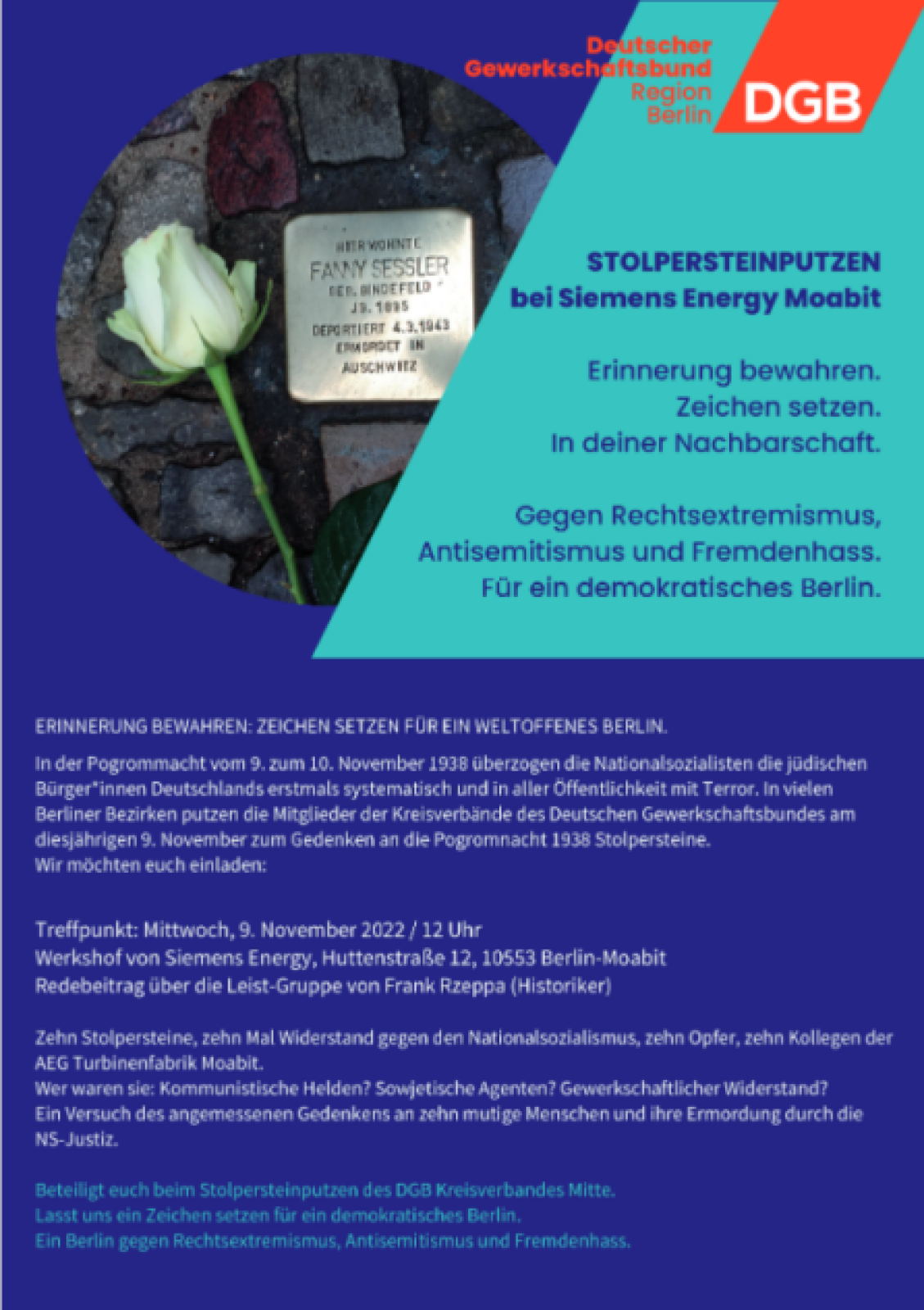 Der DGB Berlin-Brandenburg und der DGB Kreisverband Mitte organisiert in diesem Jahr am 9. November, 12.00 Uhr, eine solche Putzaktion auf dem Werkshof von Siemens Energy im Wedding,Huttenstr. 12 (ehemaliges AEG Turbinenfabrik).