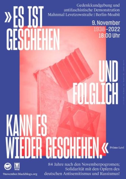GedenkkundgebungIn Moabit veranstaltet ein antifaschistisches Bündnis um die Berliner Vereinigung der Verfolgten des Naziregimes – Bund der Antifaschistinnen und Antifaschisten VVN-BdA ab 18:00 Uhr ein Gedenken in der Levetzowstraße am Mahnmal für die deportierten Berliner Juden. Bei diesem seit 1990 jährlich stattfindenden Gedenken werden auch Zeitzeug*innen sprechen.