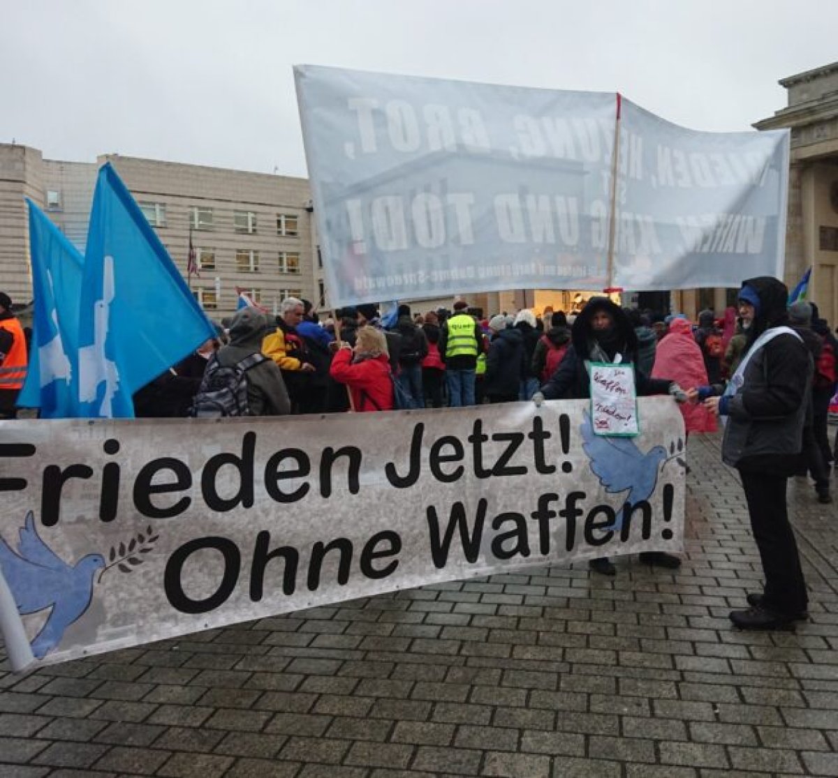 Foto: Berlin gegen Nazis, Kundgebung "Friko", 24.02.2022, Pariser PlatzVon Beginn an sprachen auch bekanntere Personen aus bundesweiten Friedensinitiativen auf den rechtsoffenen Demonstrationen vom "Bündnis für Frieden". Es ist aufgrund dieser sich wiederholenden Zusammenarbeit sehr wahrscheinlich, dass die bundesweite Mobilisierung von Friedensinitiativen zu einer Friedensdemonstration am 25. November am Brandenburger Tor ein zentraler Anknüpfungspunkt auf der verschwörungsideologischen Demonstration am 4. November sein wird.