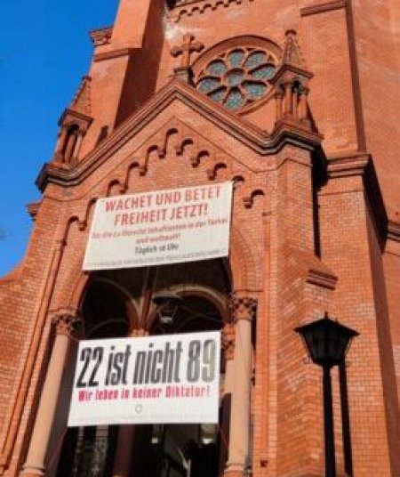 Positionierung gegen die Instrumentalisierung von 1989, Gethsemanekirche 2022Eines der zentralen Narrative der verschwörungsideologischen Versammlungen seit dem Frühjahr 2020 ist der angebliche Widerstand gegen eine „Corona-Diktatur“ häufig verbunden mit Verharmlosungen des Nationalsozialismus, mit dem die staatlichen Maßnahmen zur Eindämmung der COVID-Pandemie verglichen wurden. Seit Beginn der verschwörungsideologischen Versammlungen gab es aber auch Vergleiche mit der Endphase der DDR und dem eigenen Handeln als friedliche Demokratiebewegung für Menschenrechte oder als Protagonist_innen einer erneuten „Wende“ wie 1989.