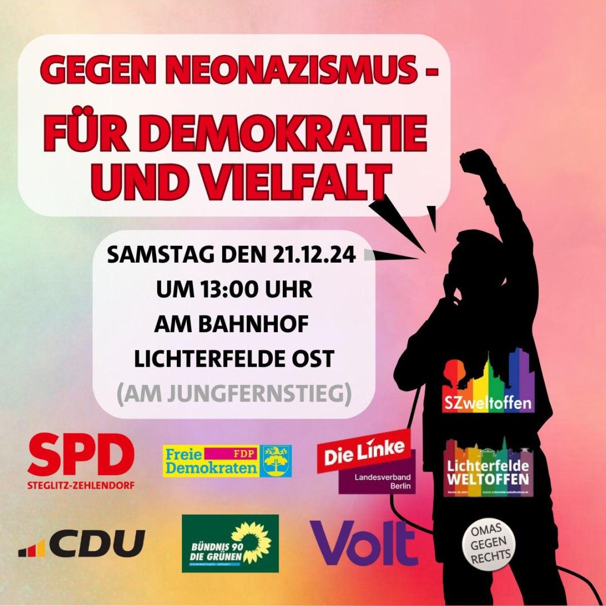 Kundgebung am 21. Dezember in LichterfeldeAls Antwort auf den erwähnten brutalen Neonazi-Angriff in Lichterfelde organisiert ein breites Bündnis außerdem schon am Samstag, den 21. Dezember, eine Solidaritätskundgebung. Demokratische Parteien aus dem Bezirk, die Omas gegen Rechts und die zivilgesellschaftlichen Bündnisse Steglitz-Zehlendorf weltoffen und Lichterfelde weltoffen rufen dazu auf.