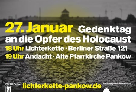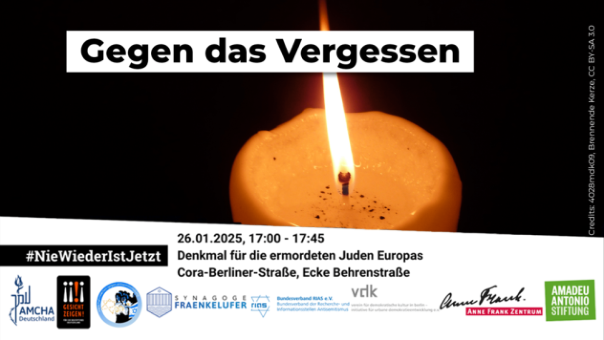 Ebenfalls am 26. Januar findet um 17.00 Uhr eine Gedenkveranstaltung am Denkmal für die ermordeten Juden Europas statt. AMCHA Deutschland, das Anne Frank Zentrum, der Bundesverband RIAS e.V. sowie der Verein für Demokratische Kultur in Berlin (VDK) e. V., Trägerverein u.a. von Berlin gegen Nazis und der MBR, rufen gemeinsam mit weiteren Organisationen wie bereits im vergangenen Jahr dazu auf, am Denkmal Kerzen zu entzünden.