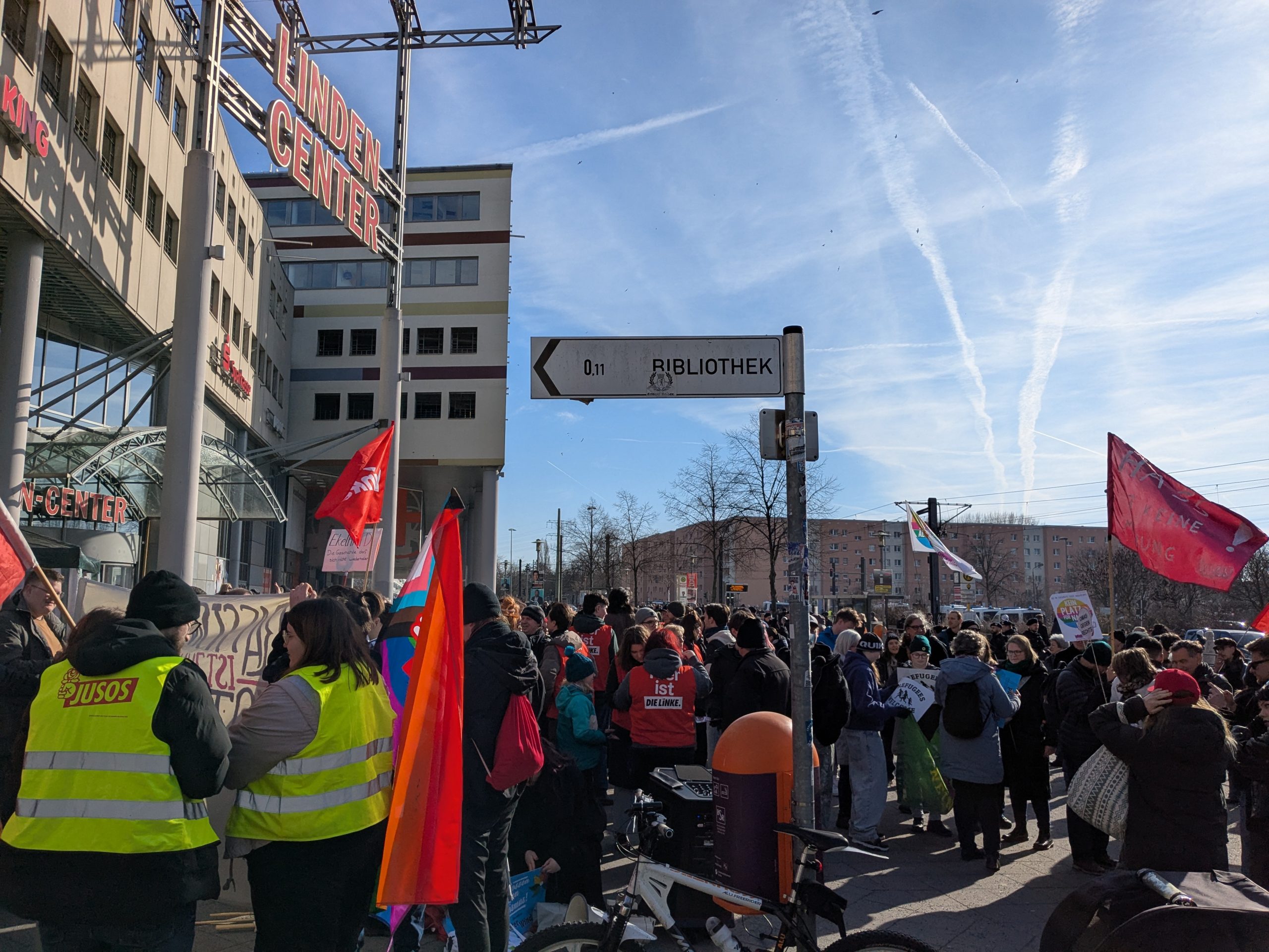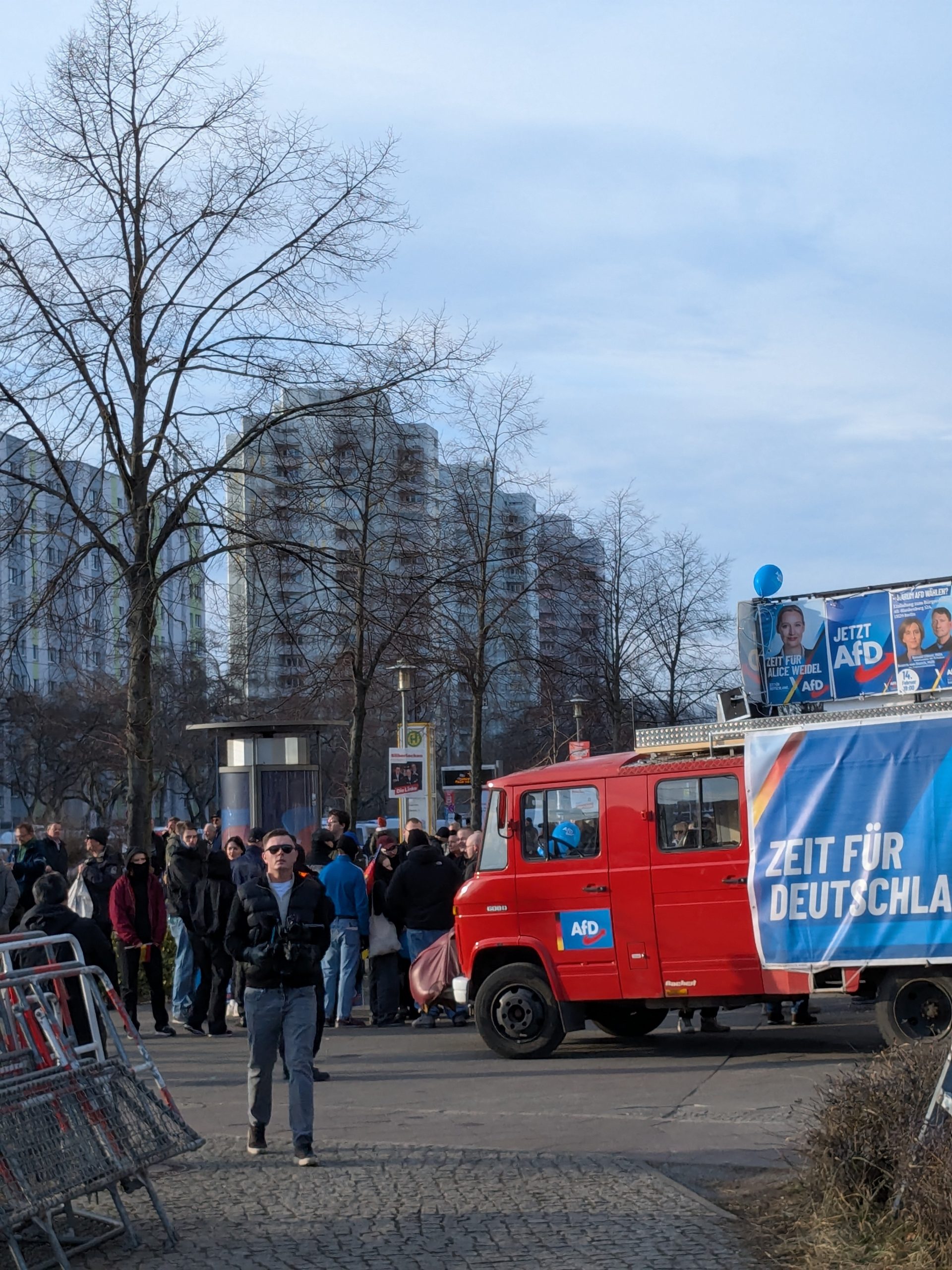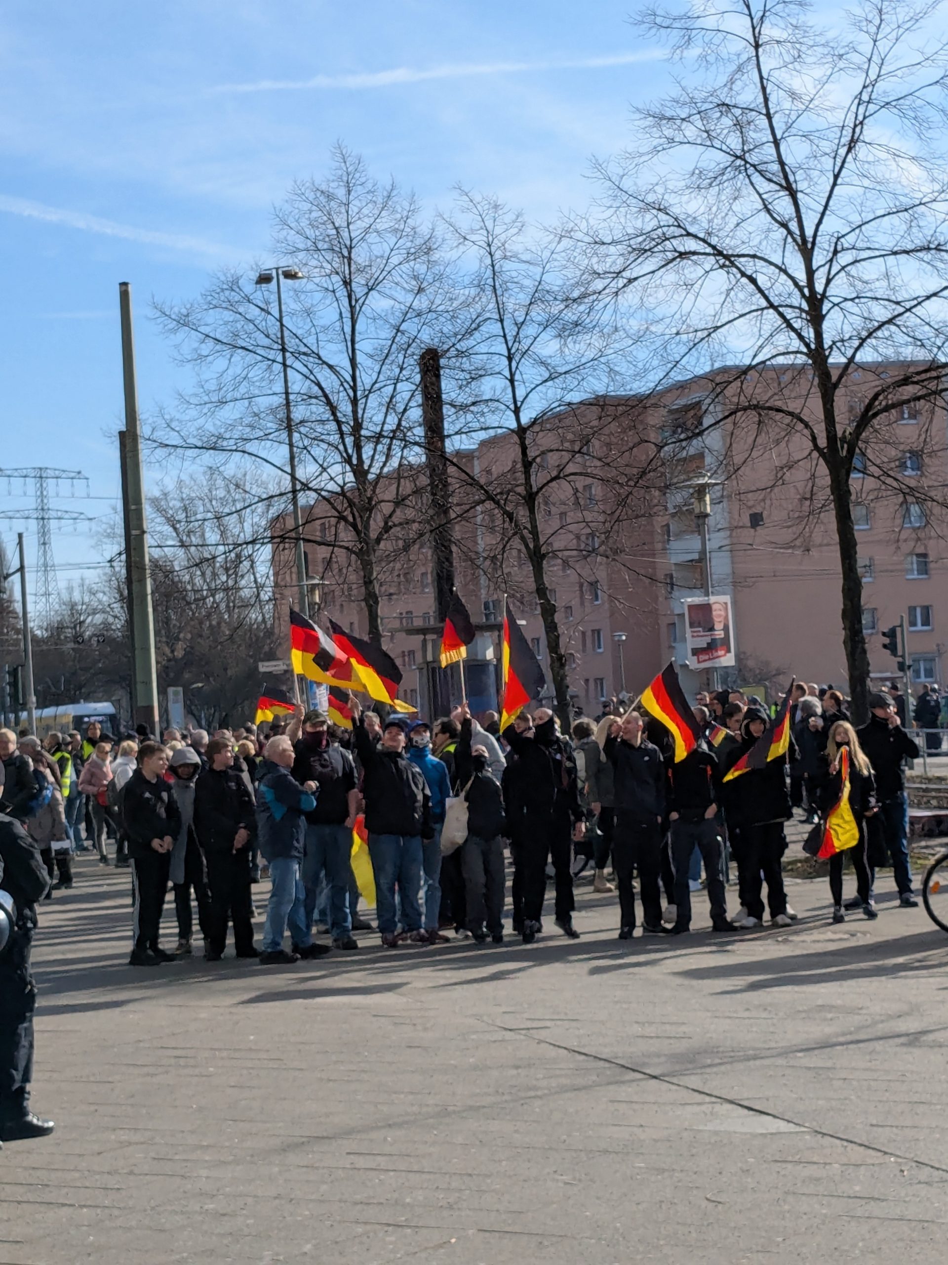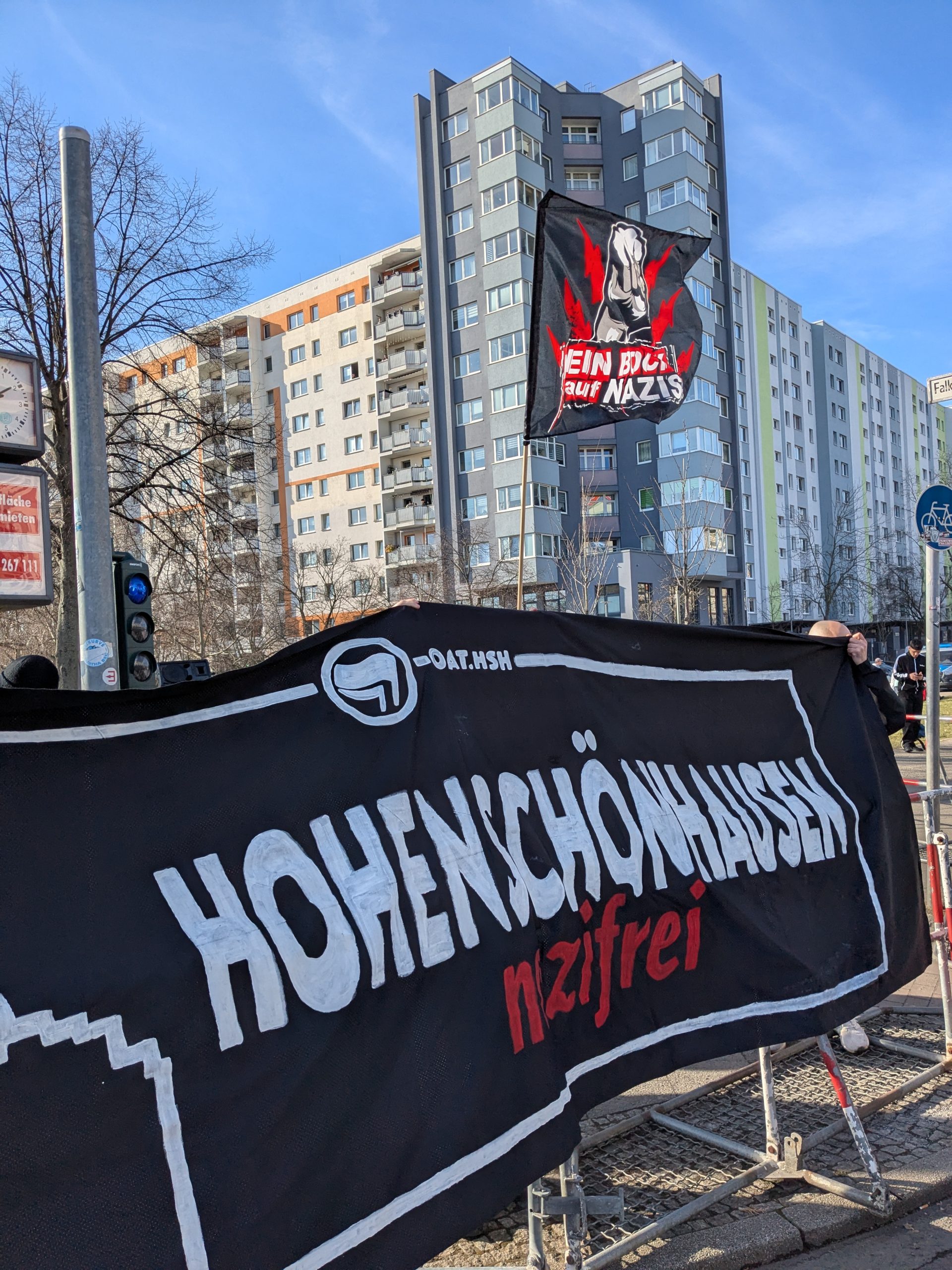Proteste auch in HohenschönhausenAuch für Hohenschönhausen hatten sich am 22. Februar einzelne junge Neonazis aus dem selben Milieu angekündigt. Hier fand der Wahlkampfabschluss der in weiten Teilen rechtsextremen AfD vor dem Einkaufszentrum „Linden-Center“ statt. Die Neonazis wollten sowohl an diesem teilnehmen als auch die dagegen gerichteten Versammlungen stören. Tatsächlich fanden sich bereits beim Aufbau der AfD-Kundgebung zwei Gruppen größtenteils vermummter Neonazis ein. Diese verblieben die ganze Zeit bei der Wahlkampfveranstaltung und schwenken demonstrativ Deutschlandflaggen in Richtung der Gegenproteste.