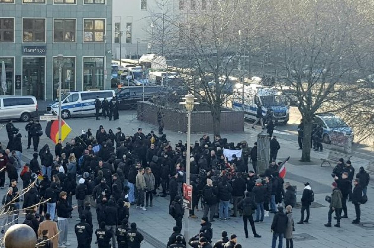 Neonazis sammeln sich am S-Bhf. FriedrichstraßeNeben bekannten Berliner Protagonisten aus dem „Deutschen Jugend Voran“-Milieu waren auch Auswärtige vor Ort, die mutmaßlich den Labels „Chemnitz Revolte“ und „Jung & Stark“ Sachsen-Anhalt zuzuordnen sind. Nachdem die „Jungen Patrioten Deutschland (JPD)“ im Vorfeld stark mobilisiert hatten, fühlten sich einige junge teilnehmende Neonazis offenbar zu diesem neueren Label gehörend. Mindestens eine Person trat in Kleidung der „Identitären Bewegung (IB)“ Berlin auf. Es nahm mindestens ein Politiker der AfD teil. Zudem waren erneut einige rechte Streamer unterwegs, die nicht nur den Aufmarsch begleiteten, sondern auch den Gegenprotest provozierten. Die überwiegend vermummten und martialisch auftretenden Neonazis versuchten auf ihrer Route vom S-Bahnhof Friedrichstraße zum Hauptbahnhof mehrmals, den Aufmarsch zu verlassen und die Gegenproteste anzugreifen.