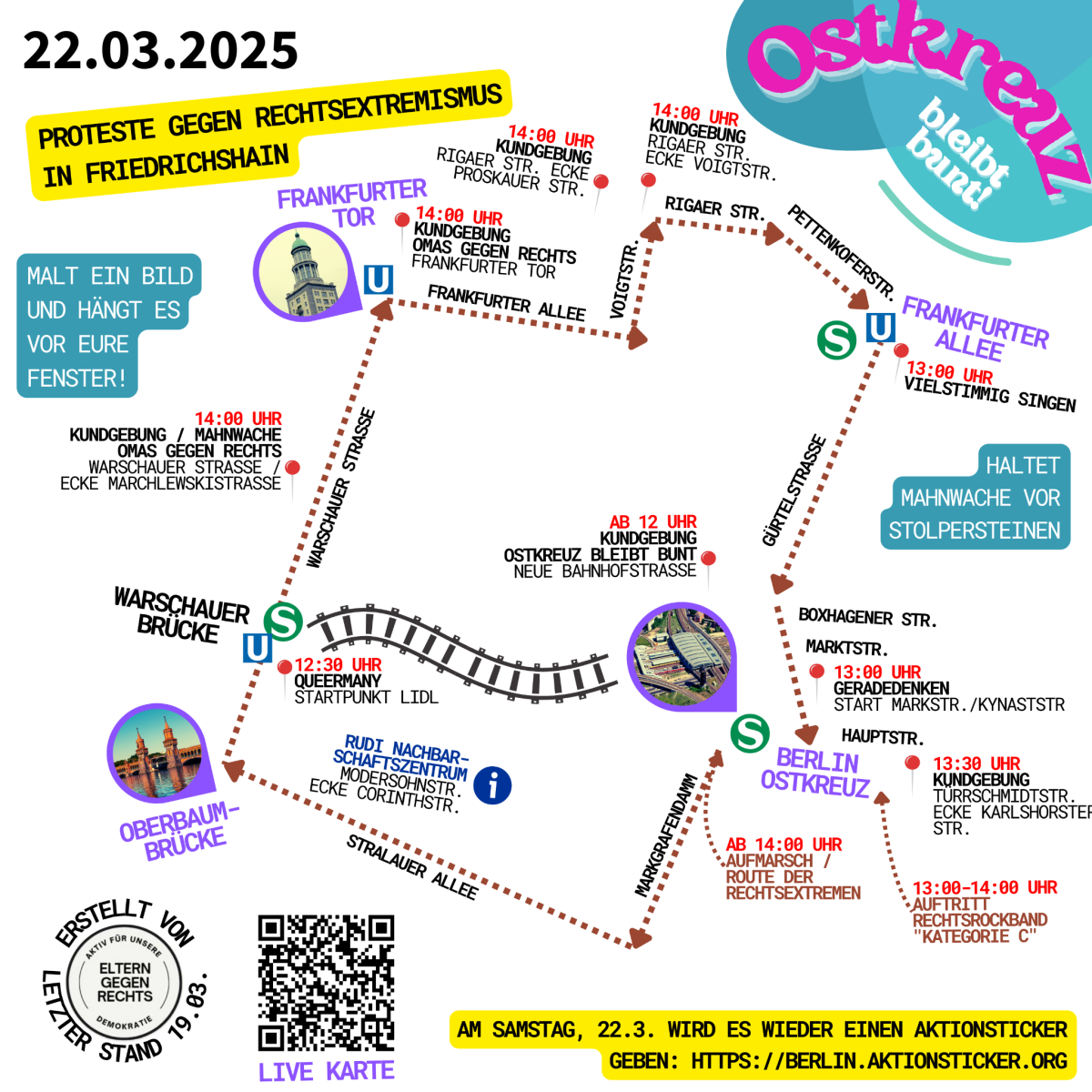 Die ELTERN GEGEN RECHTS haben eine hilfreiche Karte für den 22.3.2025 erstellt. Stand ist der 19.3.2025. Sollte sich die Karte ändern, wird sie auch hier aktualisiert:
