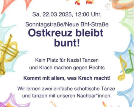 Ab 12 Uhr wird auf der Nordseite des Bahnhofs Ostkreuz unter dem Motto „Ostkreuz bleibt bunt! Kein Platz für Nazis!“ getanzt. Treffpunkt dafür ist die Neue Bahnhofsstraße 36.
