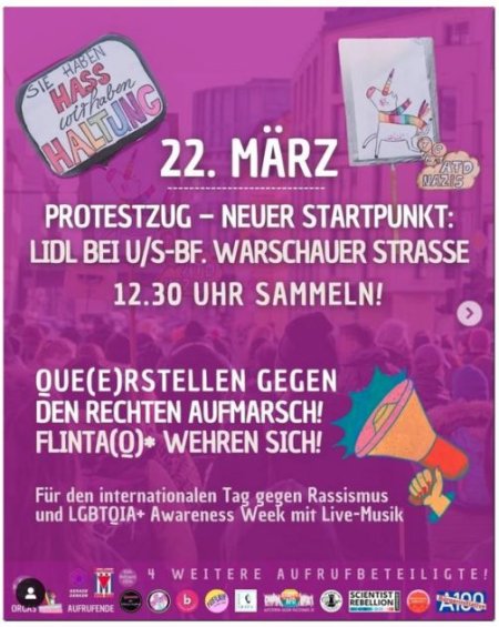 NEUER STARTPUNKT! Der Startpunkt der Demo „Que(e)rstellen gegen rechten Aufmarsch – FLINTA(Q)* wehren sich!“ wurde verschoben und startet nun um 12:30 Uhr beim Lidl am U-/S-Bahnhof Warschauer Straße und läuft Richtung Osten. Hier ist es wichtig, auf tagesaktuelle Infos zu achten und ggf. Umwege einzuplanen.