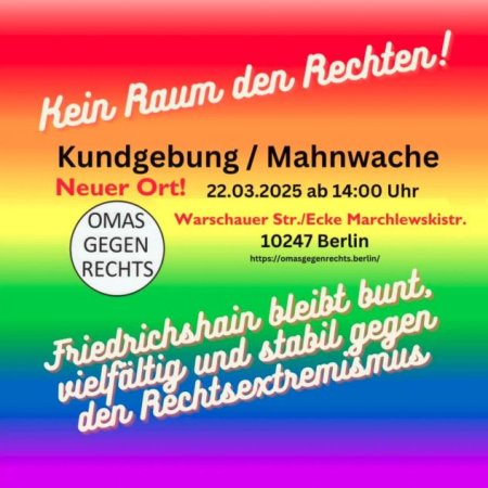 Um 14 Uhr beginnt an der Ecke Warschauer Str./Marchlewskistr. die Gegenkundgebung "Kein Raum des Rechten! Friedrichshain bleibt bunt, vielfältig und stabil im Kampf gegen den Rechtsextremismus!" der OMAS GEGEN RECHTS.Berlin.