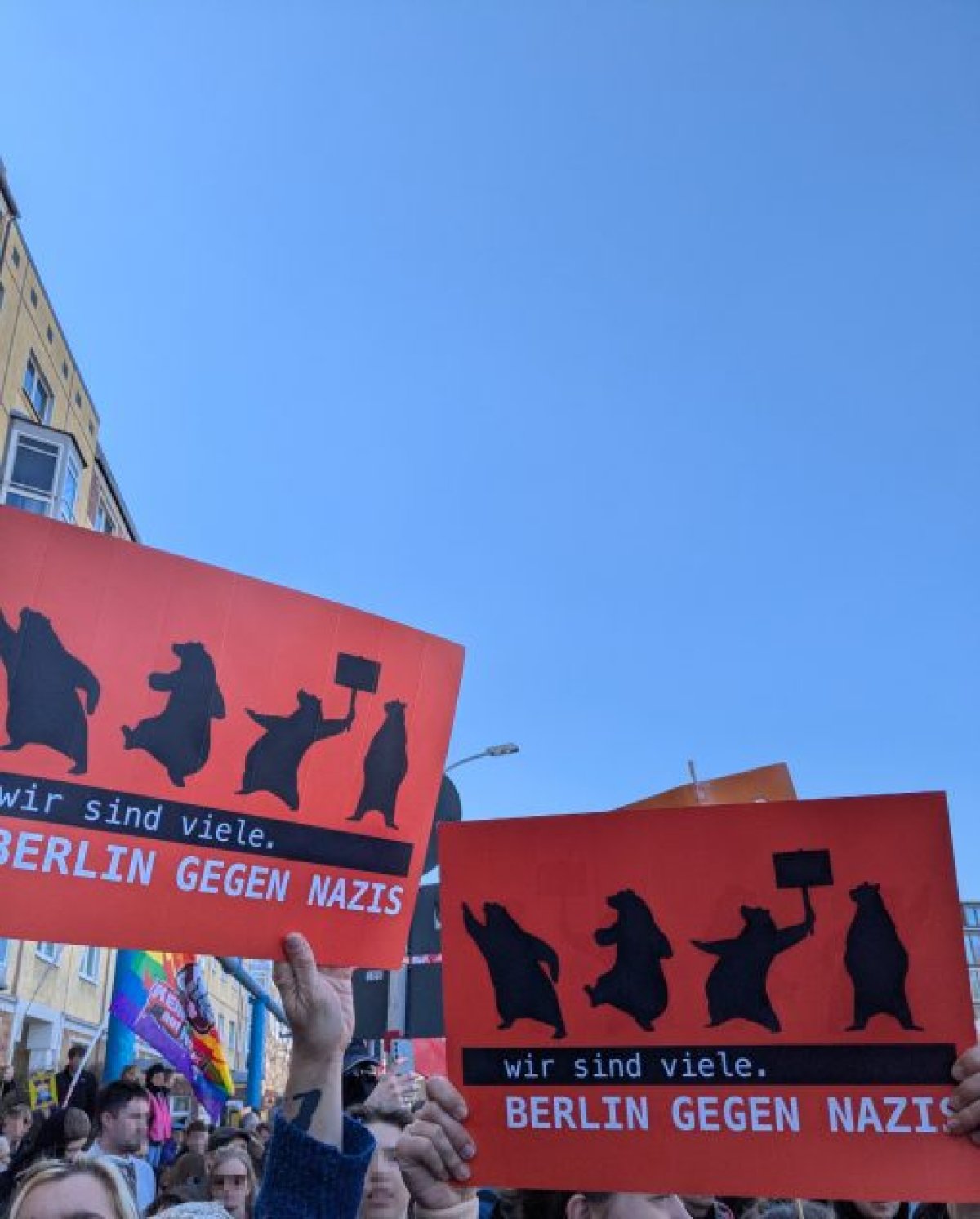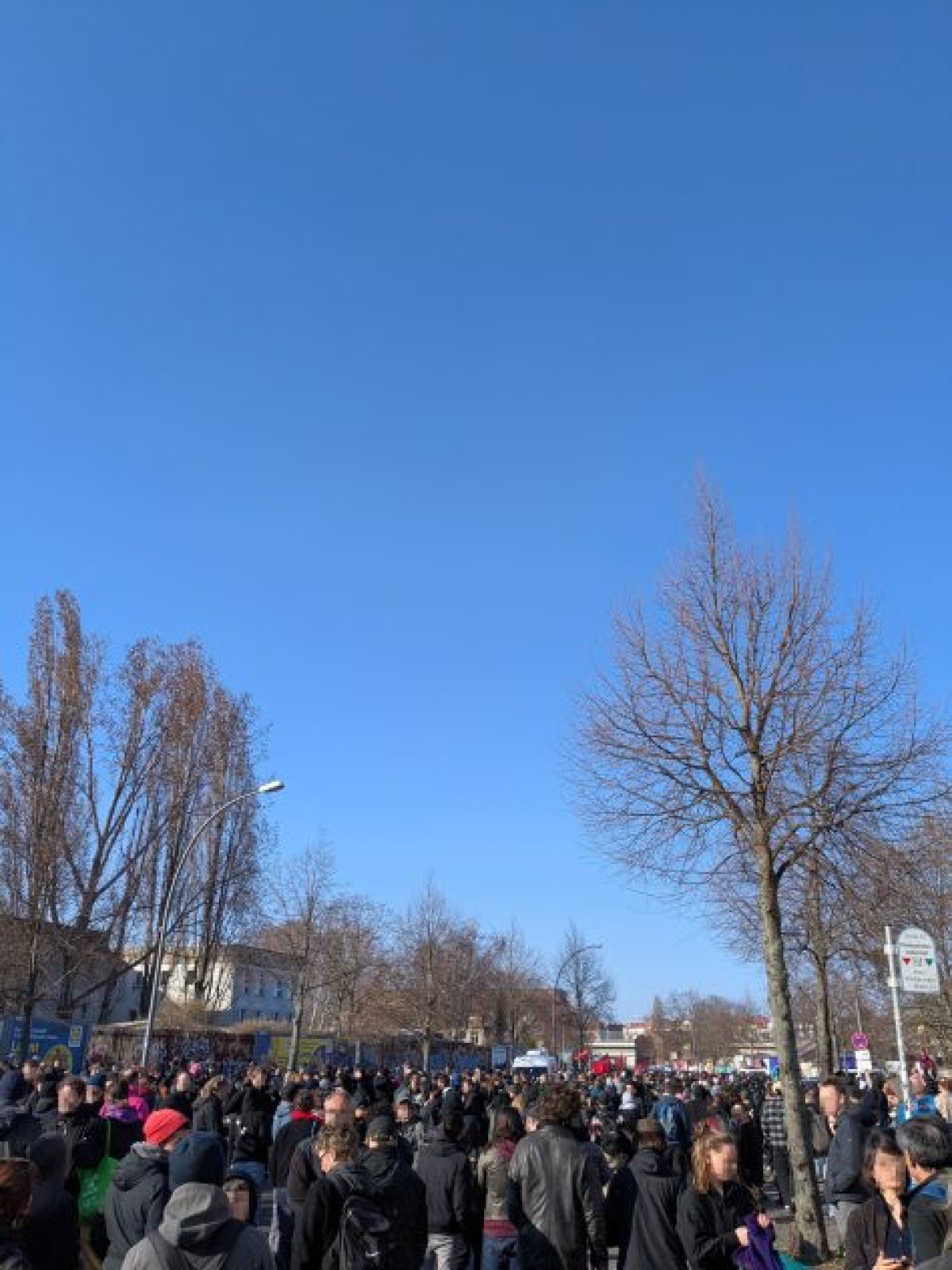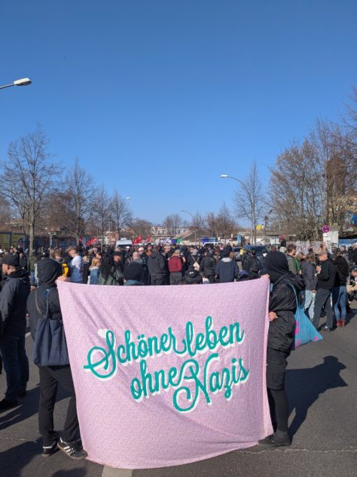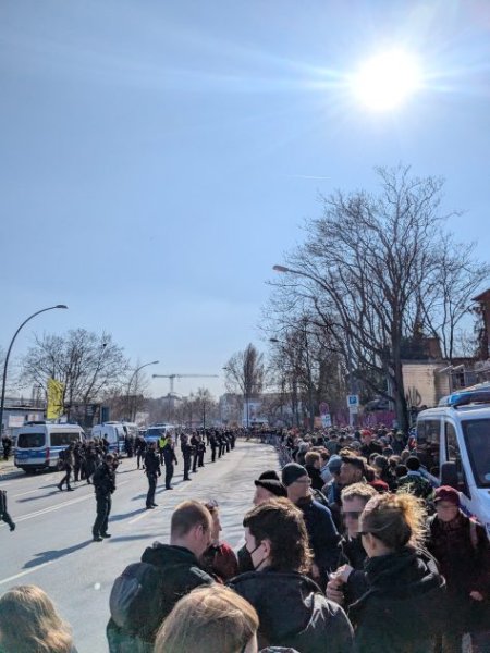 Vielfältige Gegenproteste in FriedrichshainEin großer Erfolg des Tages waren hingegen die Gegenproteste und ihre mehreren tausend Teilnehmenden, die zentral am Bahnhof Ostkreuz, aber auch dezentral an der ursprünglich angemeldeten Aufmarschroute standen und in den verschiedenen Kiezen unterwegs waren. Die meisten der zahlreichen Demonstrationen, die um den Bahnhof herum angemeldet waren, kamen ab etwa 14 Uhr auf dem Markgrafendamm zusammen. Menschen standen flächendeckend und friedlich auf der Straße und hatten laut Polizeibericht damit Versammlungscharakter. Dem voran gingen kleinere Proteste auf der von den Neonazis angemeldeten Route.