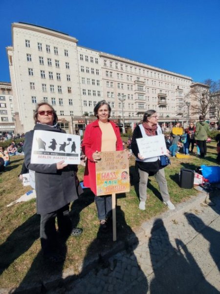 Ab 14 Uhr stand die Kundgebung der OMAS GEGEN RECHTS am Frankfurter Tor, einem Punkt an der ursprünglichen Aufmarschroute. Die 300 Teilnehmenden bezogen unter dem Motto „Für Gerechtigkeit und Solidarität, gegen Rechtsextremismus“ auch dezentral und abseits des Ostkreuzes klar Stellung zum Neonazi-Aufmarsch in Friedrichshain – dieser sollte es nicht einmal in die Nähe des Frankfurter Tors schaffen.