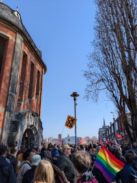 Bereits um 12:00 startete die Initiative „Ostkreuz bleibt bunt“ mit ihrem Kiezprogramm an der Sonntagsstraße. Um 12:30 Uhr lief die ca. 900 Personen starke Queermany-Demo unter dem Motto „que(e)rstellen gegen rechten Aufmarsch – FLINTA(Q)* wehren sich“ vom U-Bahnhof Warschauer Straße aus vorbei am RuDi-Nachbarschaftszentrum bis ans Ende der Persiusstraße, wo die Teilnehmenden zu einer Abschlusskundgebung zum Stehen kamen und sich später in die breiten Proteste auf dem Markgrafendamm einreihten.