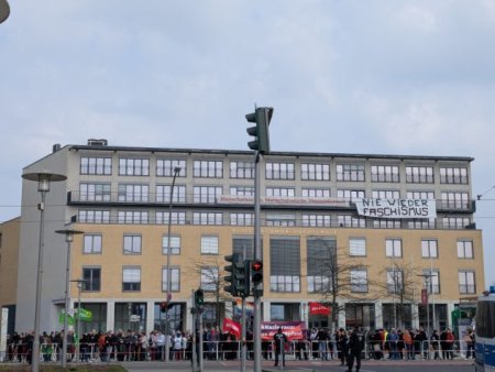 Trotz kurzer Mobilisierungszeit kamen jedoch auch mehrere hundert Personen zu Gegenprotesten in Hellersdorf zusammen. An den Platz vor der Alice-Salomon-Hochschule, an deren Hauswand ein riesiges Transparent mit den Worten „Nie wieder Faschismus“ hing, hatte das Bündnis für Demokratie und Toleranz Marzahn-Hellersdorf aufgerufen – unterstützt vom Bezirksamt und der Bezirksbürgermeisterin. Vor allem am Nachmittag, als die Neonazis ihre Abreise nach der Beendigung des Aufmarschs und trotz mehrmaliger Mahnungen der Polizei in die Länge zogen, waren die zahlreichen Menschen an der Hochschule laut hörbar und bezogen klar Stellung gegen die extrem rechte Vereinnahmung ihres Stadtteils. Dabei würden sie lautstark von den OMAS GEGEN RECHTS unterstützt.