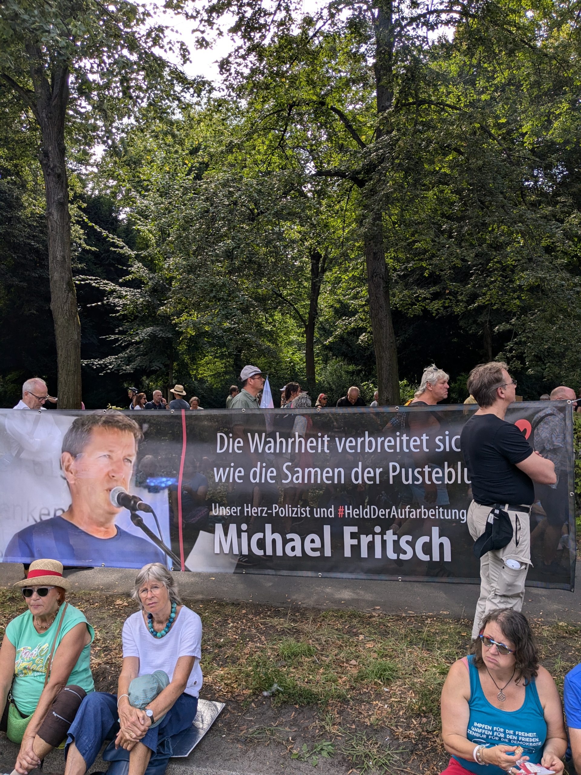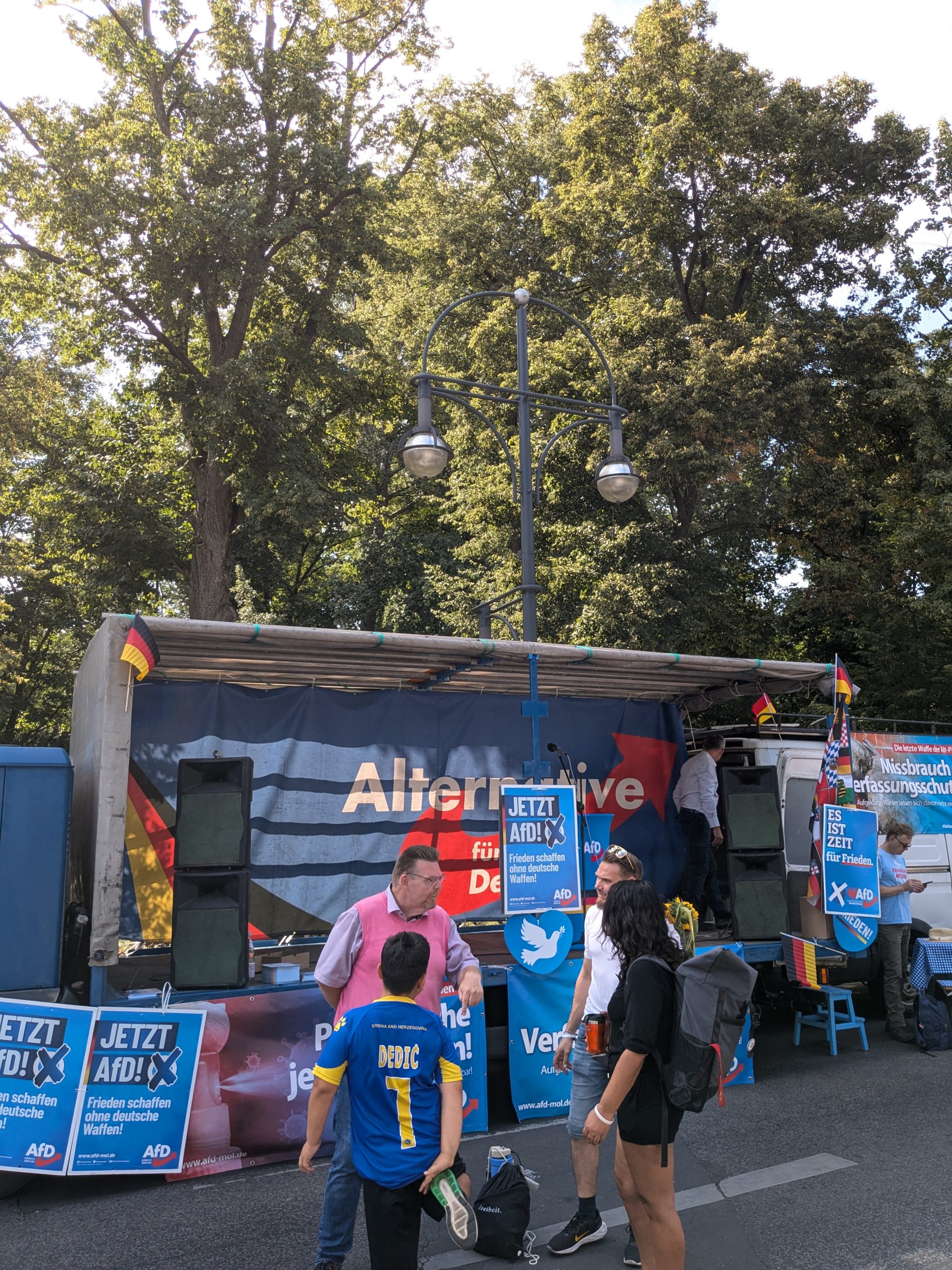 Auf der Bühne soll dieses Jahr auch der im verschwörungsideologischen Milieu populäre Musiker „Yann Song King“ auftreten. Wie wenig Berührungsängste der Künstler vor Rechtsextremen hat, zeigt sein weiteres Programm am Samstag: Abends ist er auch beim Sommerfest der „Staatsreparatur“ in Lichterfelde angekündigt. Schon 2024 trat er bei einer Veranstaltung des rechtsextremen Compact-Magazins im sächsischen Zittau auf, letzten Karfreitag bei der aus dem Umfeld der „Freien Sachsen“ organisierten „Friedensprozession“ in Dresden, wo sich Rechtsextreme und Querfront-Apologet*innen die Klinke in die Hand gaben. Als Redner*innen am Samstag sind außerdem bekannte Protagonist*innen der verschwörungsideologischen Szene sowie ein „Überraschungsgast“ angekündigt.